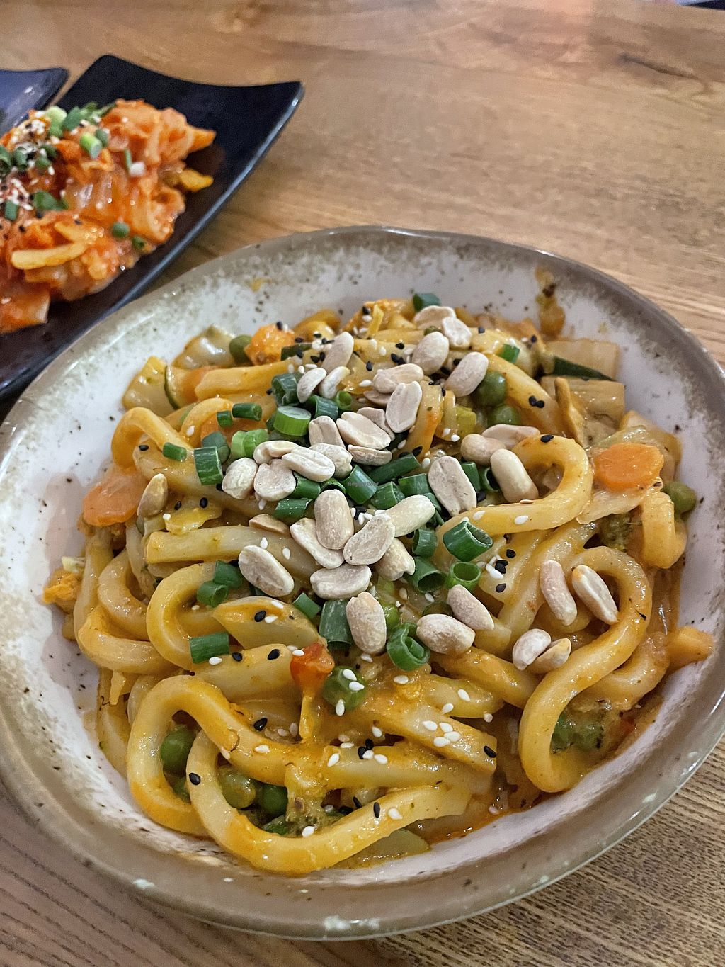 Serves meat, vegan options available. Vegan-friendly restaurant offering dishes such as wasabi coleslaw, kimchi, udon noodles, udon soup, tom yum soup, rice and vegetables, and toppoki. Open Mon-Fri 12:00-23:00, Sat-Sun 12:00-00:00.