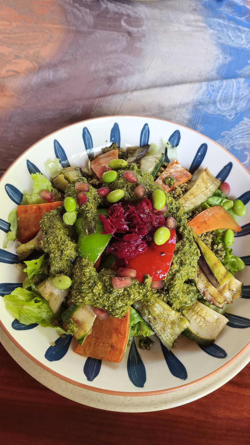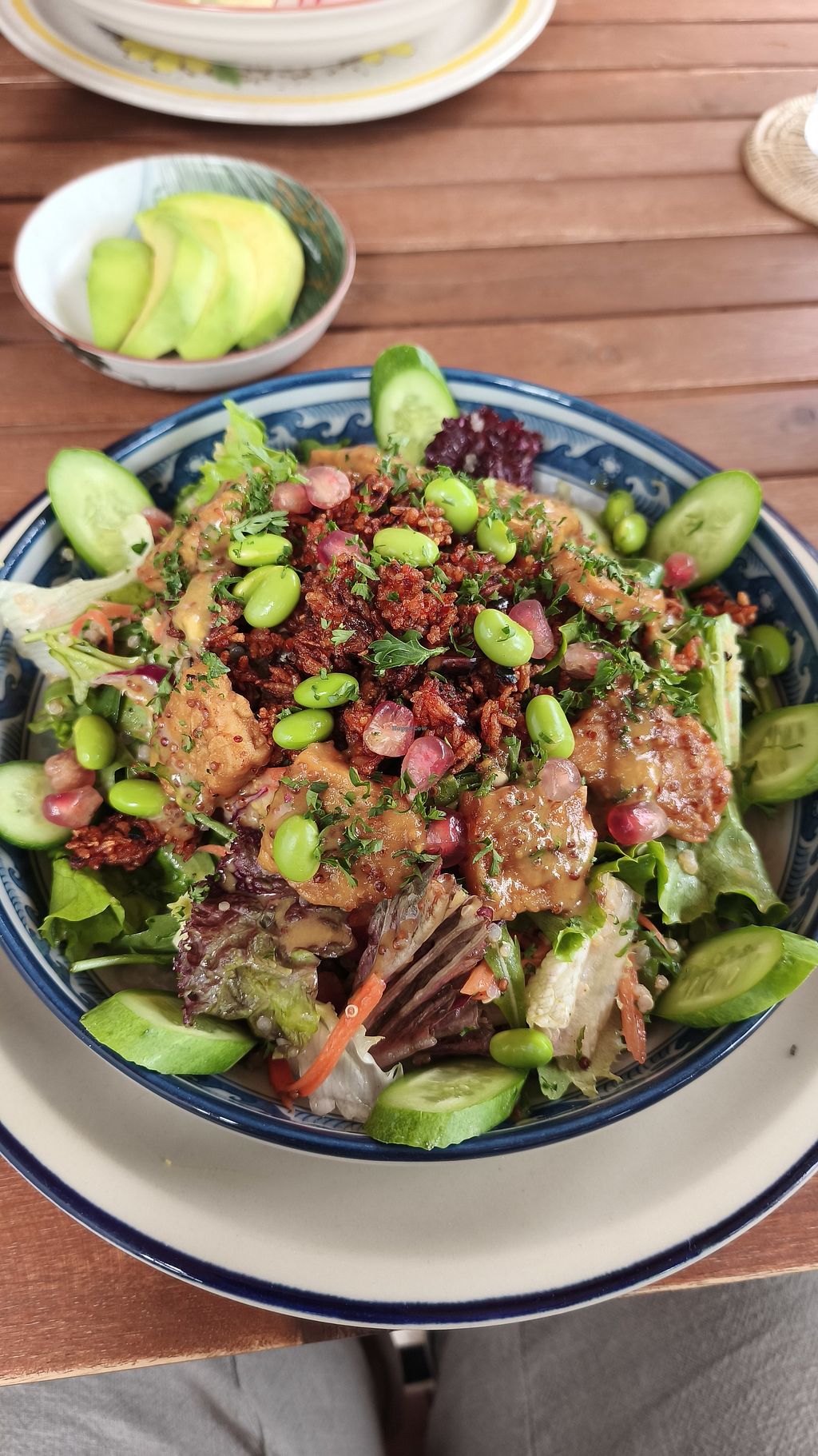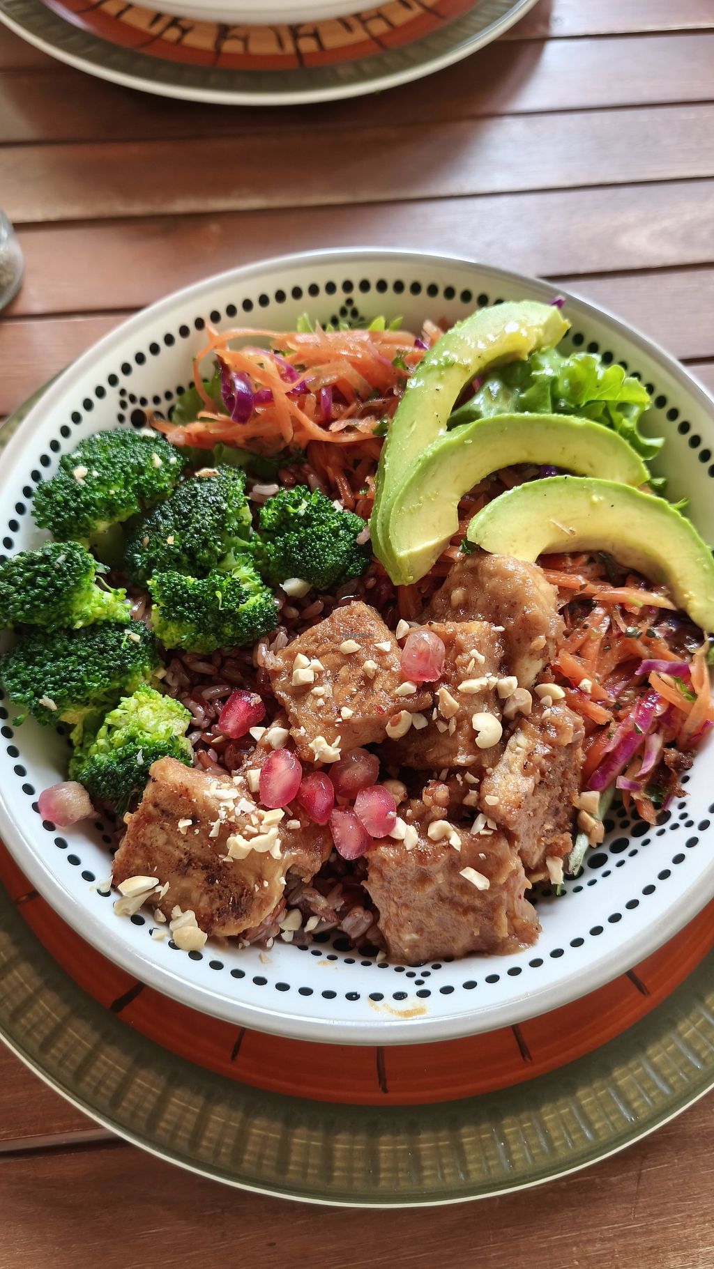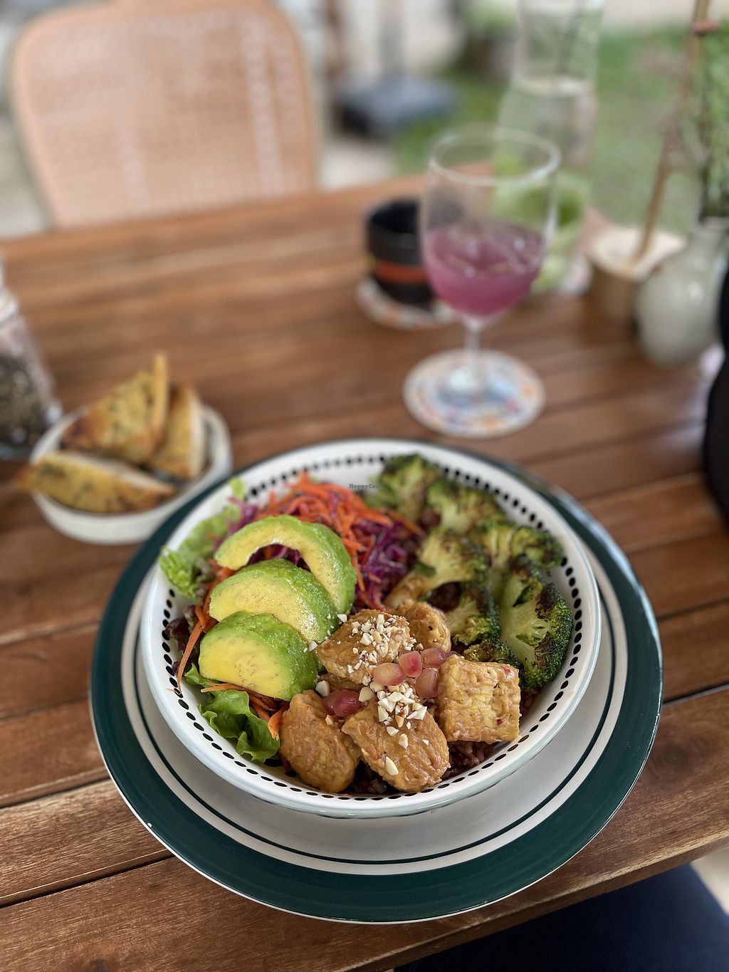 Miso Peanut & Tempeh Bowl, with garlic sourdough bread and kombucha
