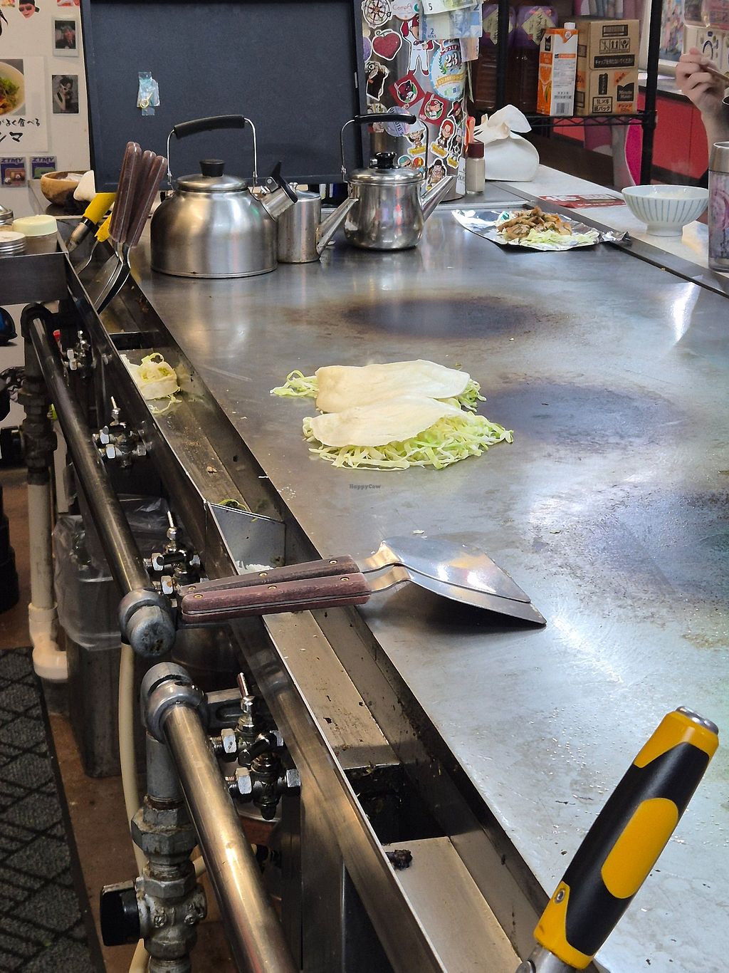 Serves meat, vegan options available. Cafe specializing in Hiroshima-style savory pancakes. The menu features a clearly labeled vegan option, the 'Vegan Special Okonomiyaki', which uses flour, noodles, cabbage, bean sprouts, shimeji mushrooms, and green onion. Open Mon-Sun 11:00am-10:00pm.
