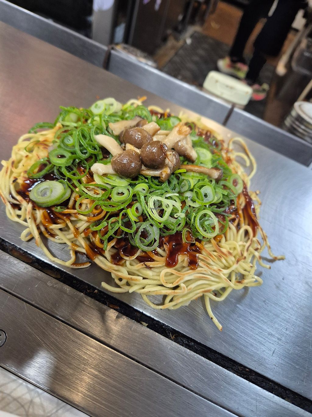 They made us the vegan okonomiyaki with mushrooms, a lot of green onions and cabbage. The noodles were crunchy it tasted so good! The vegan choice was clearly labeled on the English menu