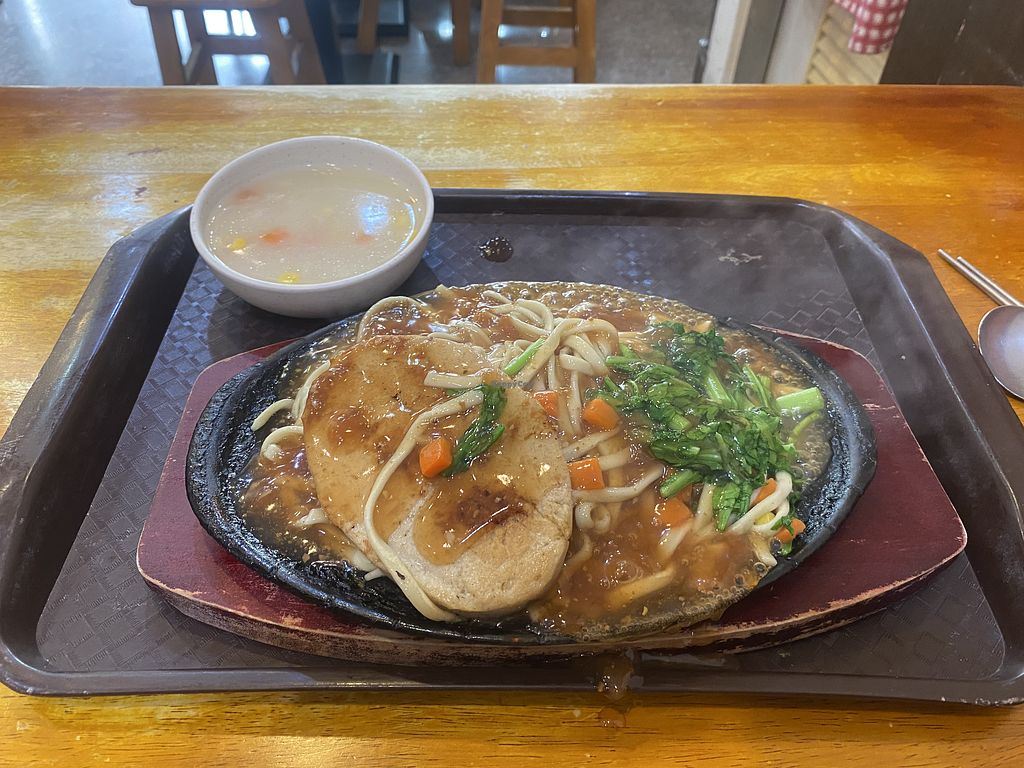 鐵板麵加扒 Noodles and "Steak" on an Iron Plate
