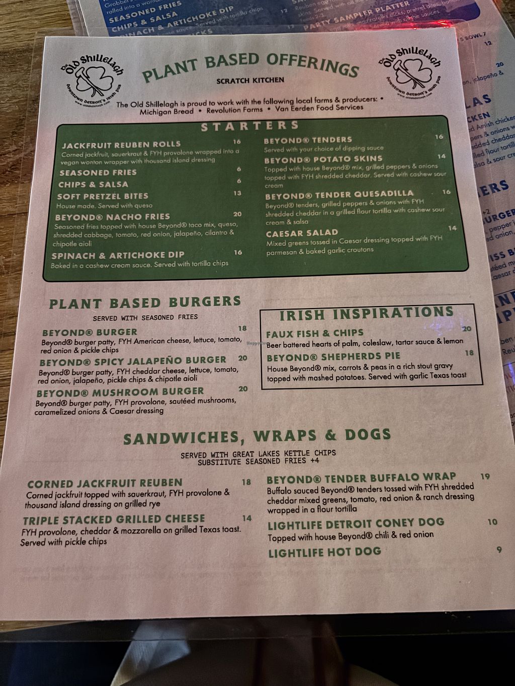 I like the mushroom smoked gouda burger, they use Beyond. The vegan Caesar dressing they put on it is really good. They also have a nice vegan nacho cheese which is good with fries or soft pretzels. I’ve had the vegan shepherds pie before too which I liked.