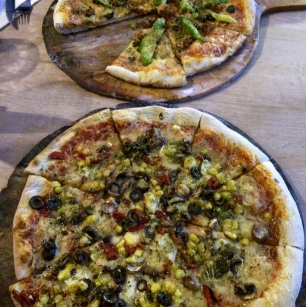 We went here just before closing so they were out of most other food options except pizza. And pizza is always a great option so we opted for that and weren't dissapointed. The pizzas are more traditional thin crust and you can choose a veggie pizza with vegan cheese.