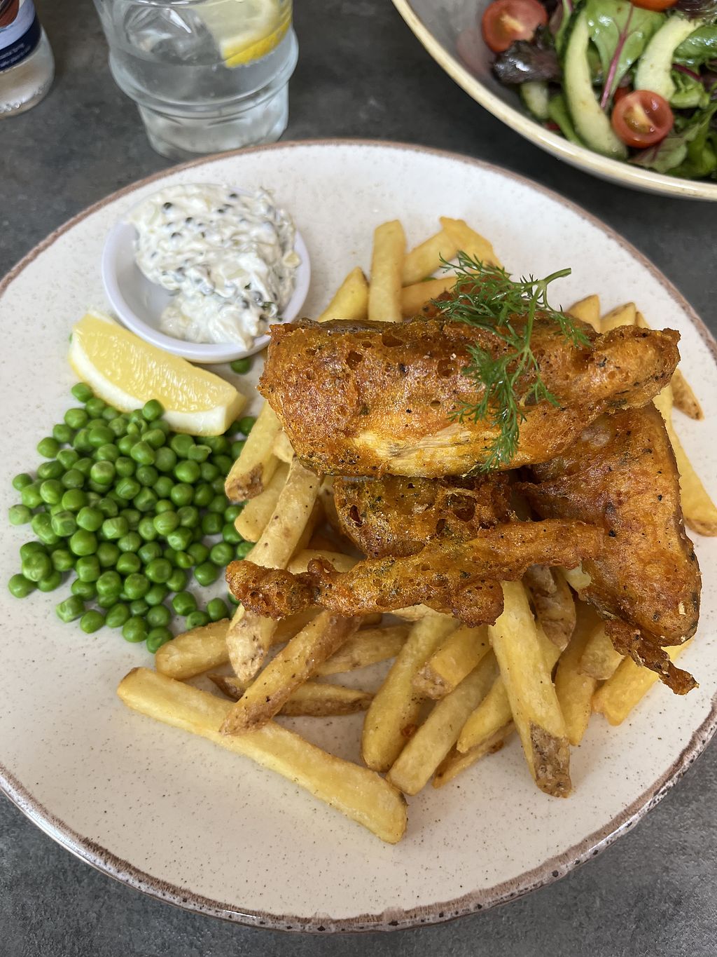 Huge portion of banana blossom battered brilliantly, with tartare sauce, fab chips and peas. Sat by the canal with plenty of room, our dogs were made very welcome and shared a portion of chips. Absolutely delicious!