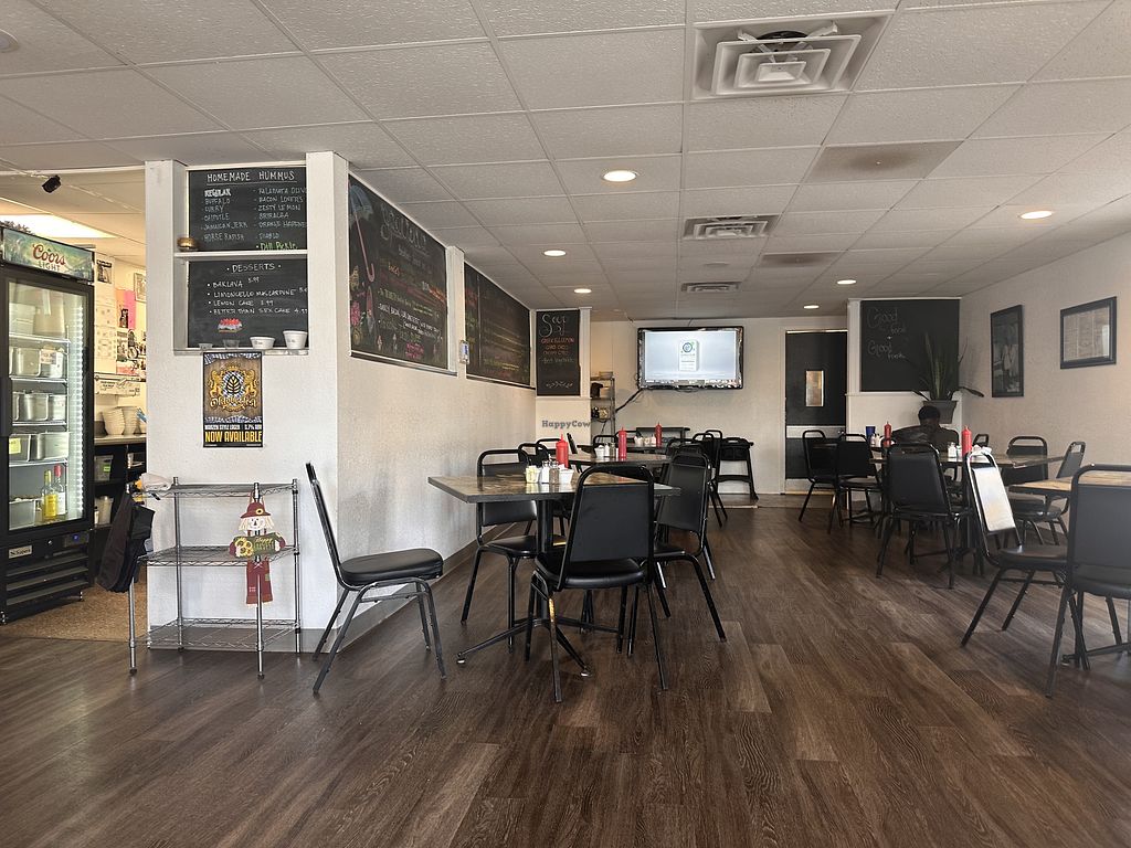 Serves meat, vegan options available. Greek restaurant serving traditional dishes with a separate vegan menu. Open Tue-Fri 9:00am-9:00pm, Sat 7:00am-9:00pm, Sun 8:00am-3:00pm. Closed Mon.