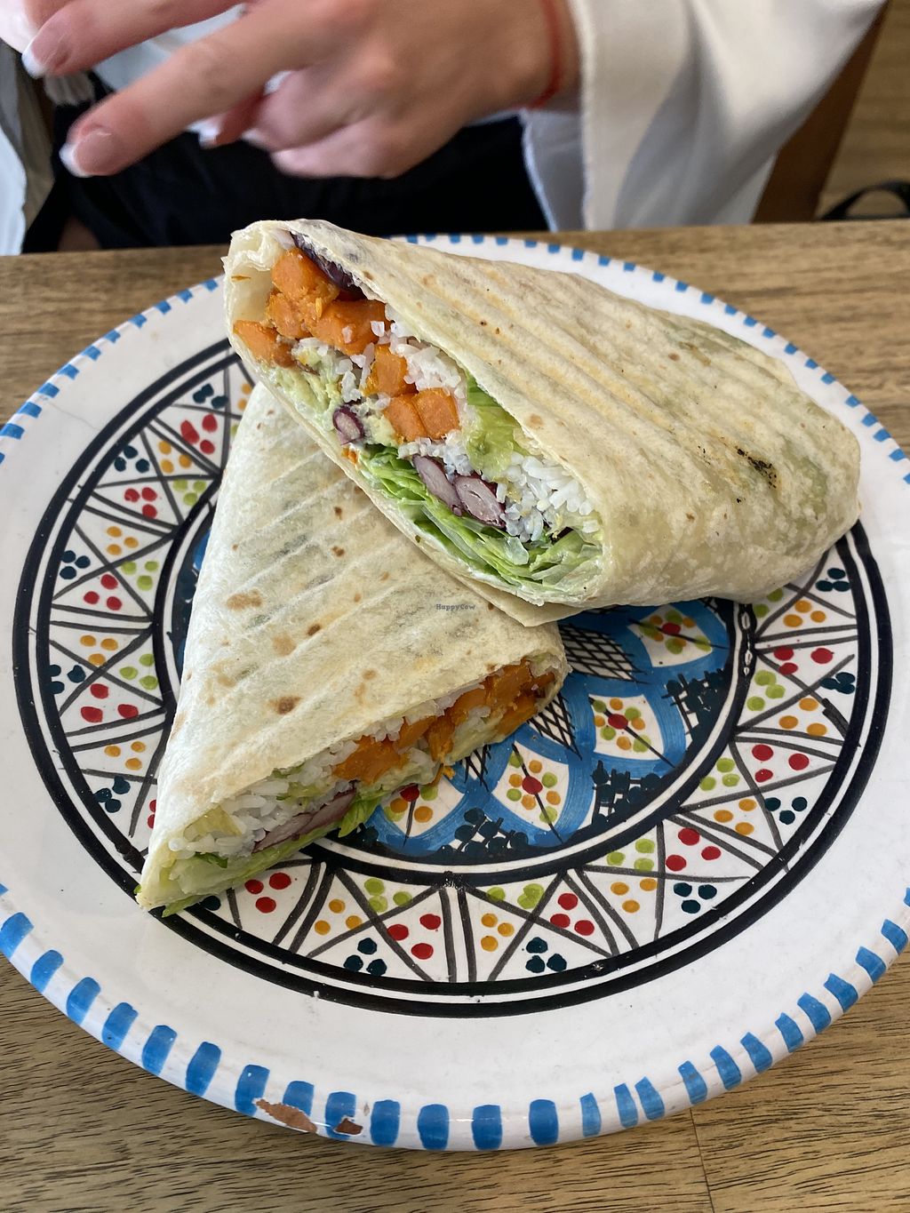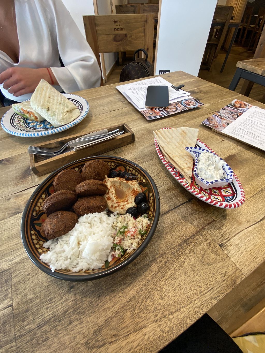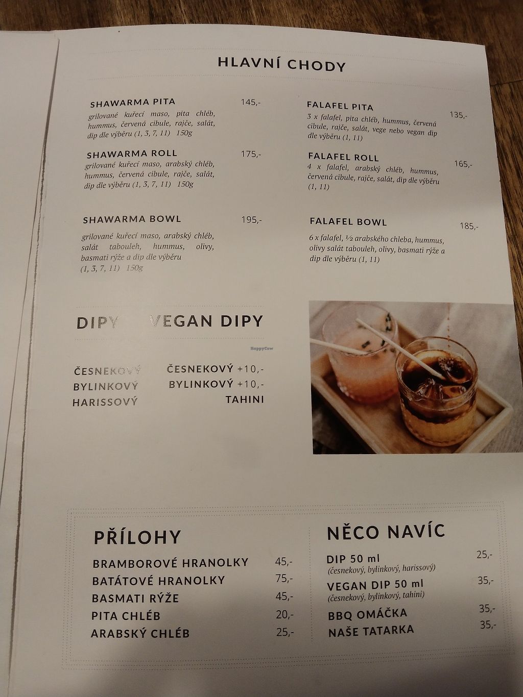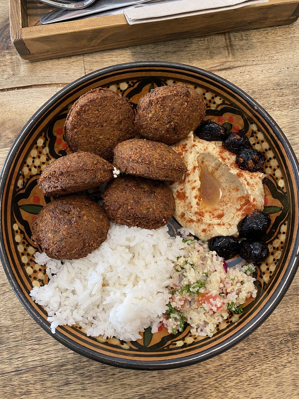 Serves meat, vegan options available. Middle Eastern food like falafel and hummus, plus burgers and tortillas. Offers one meal vegetarian and one meal vegan (during weekday only). Reported having vegan dessert. Reported closed September 2023.