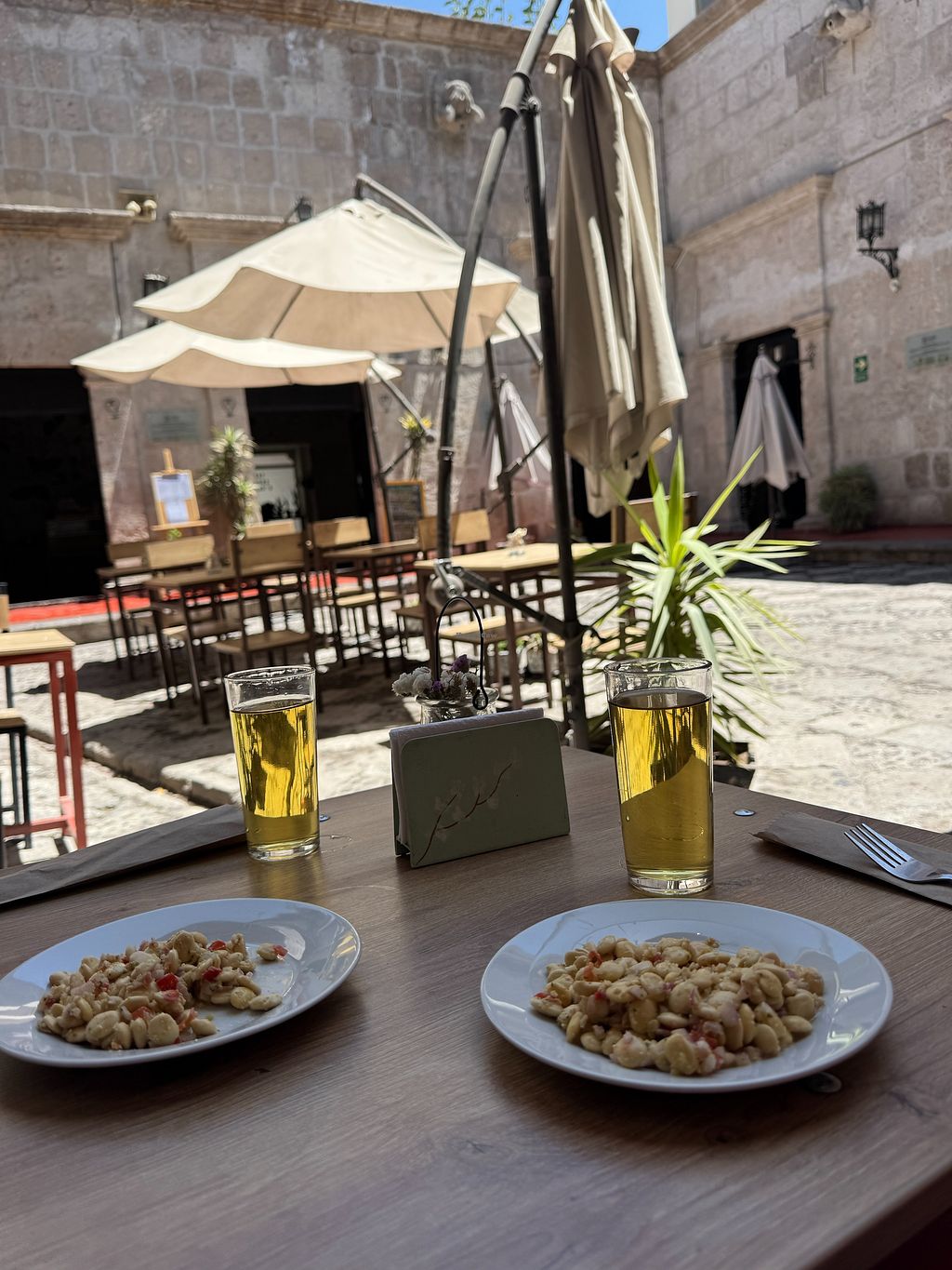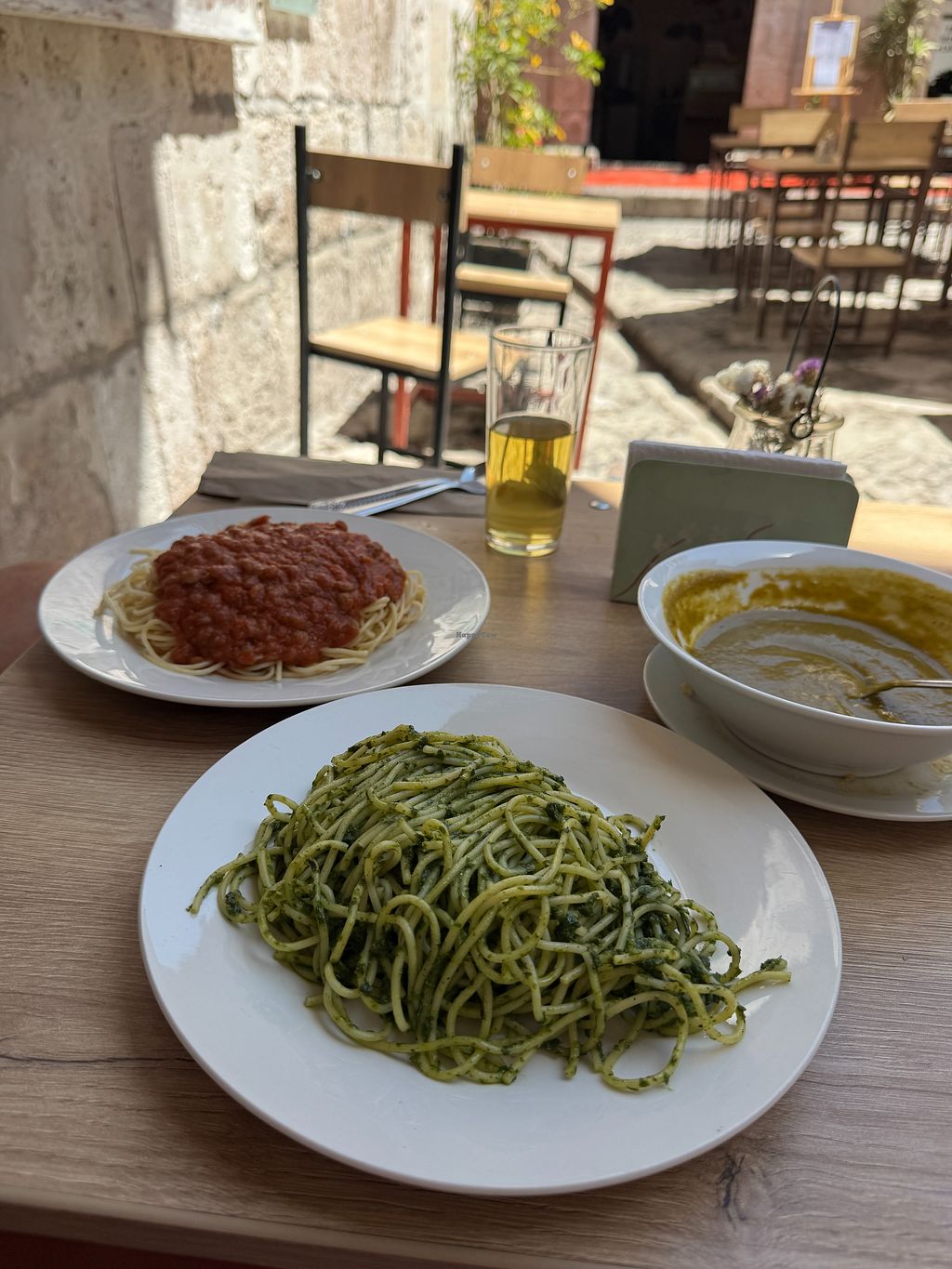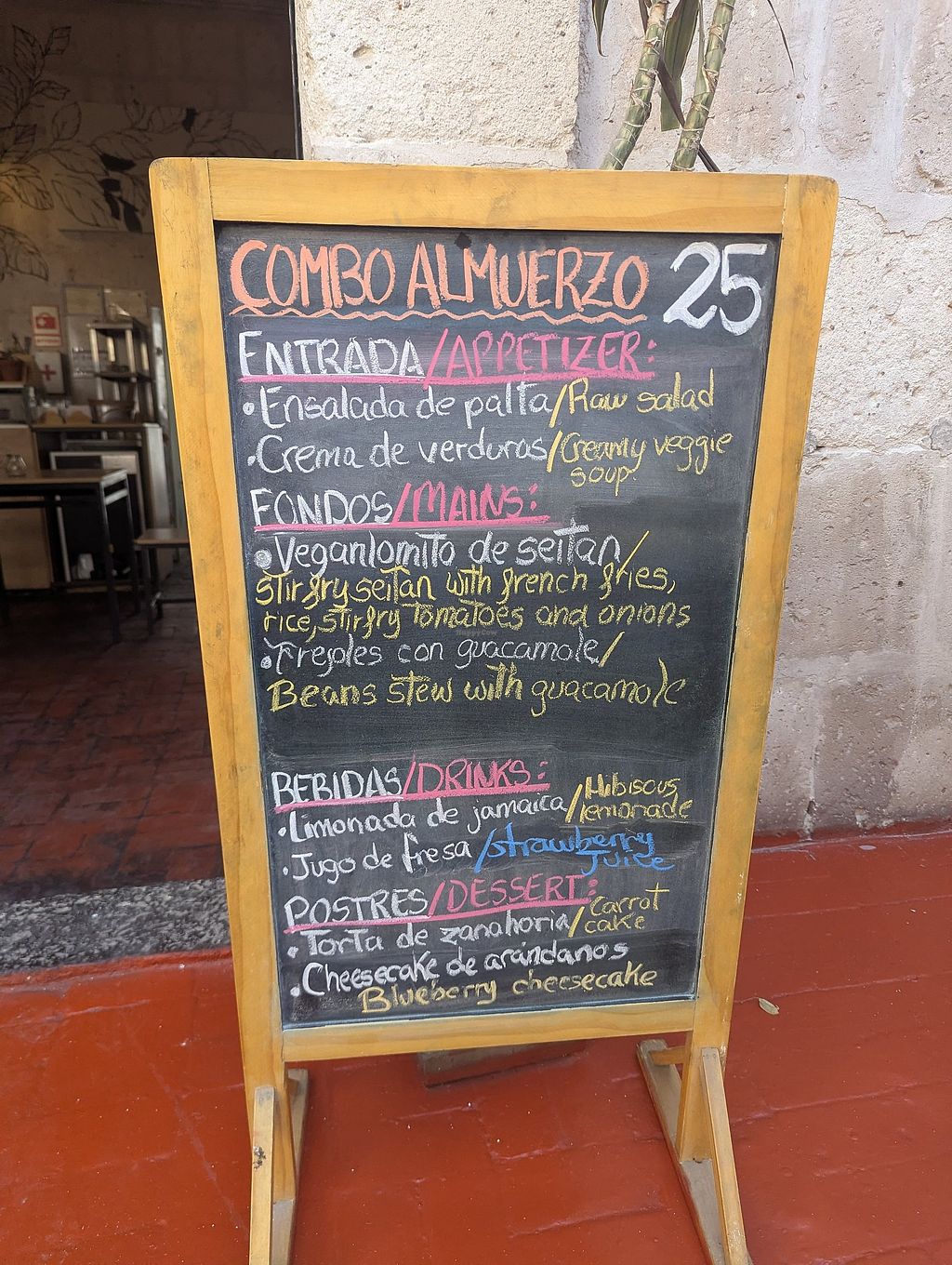 Fantastic daily menu available all day for the incredible price of 15 sols. Included a hot salad, a corn soup, options for the main (we chose a quinoa and soy dish, and a pesto pasta) and a sugar cane vegan jelly for dessert, as well as a refresco to drink. Set in a beautiful old building in the courtyard of Casona Ugarte, an absolute must visit for vegans in Arequipa.