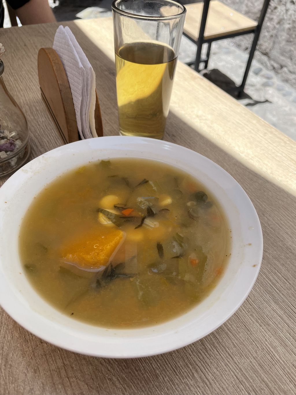 Wir hatten das Mittagsmenü bei Omphalos um 13 Soles. Der Preis ist sehr günstig, die Qualität aber auch nicht die beste. Das Mittagsmenü bestand aus einem Appetizer, einer Suppe, einer Hauptspeise und einer Nachspeise. Alle Gerichte haben etwas langweilig und ungewürzt geschmeckt. Der Ananassaft war mit Wasser aufgespritzt und kaum zu trinken.