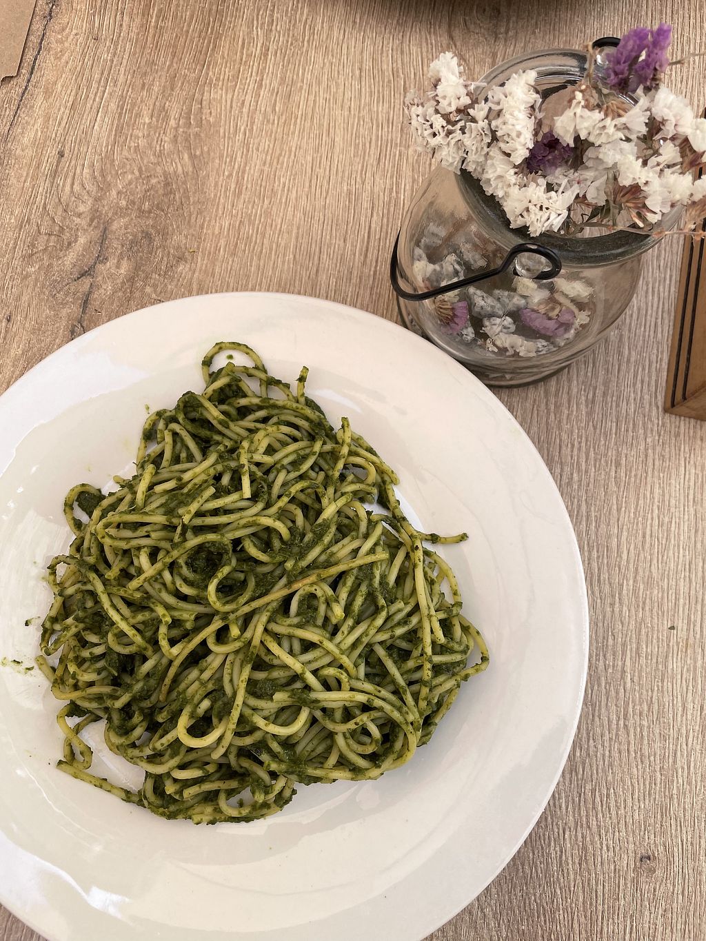 Pesto Pasta or Pasta Bolognese (Lentil). Awesome im taste and quite bit portions.