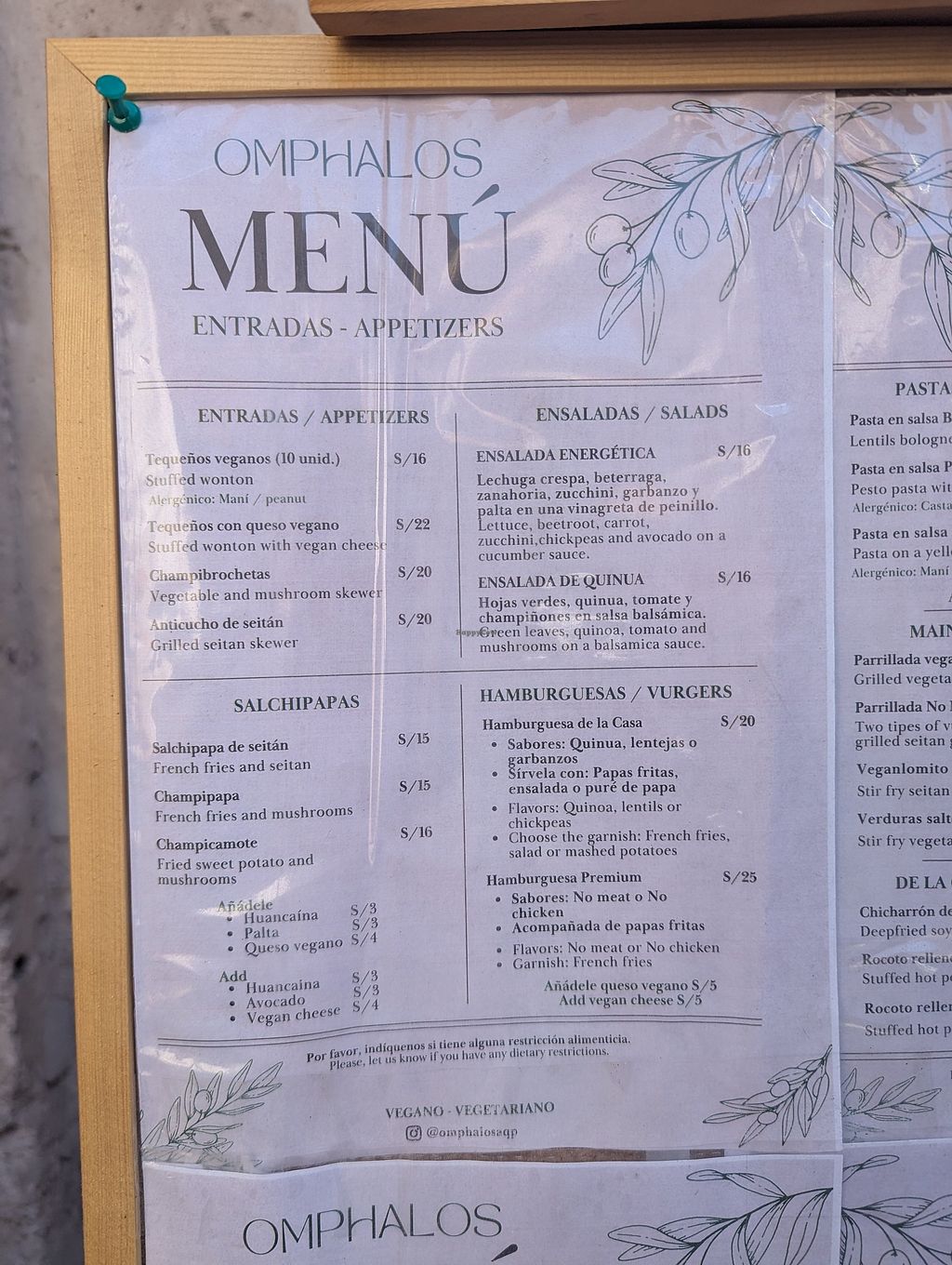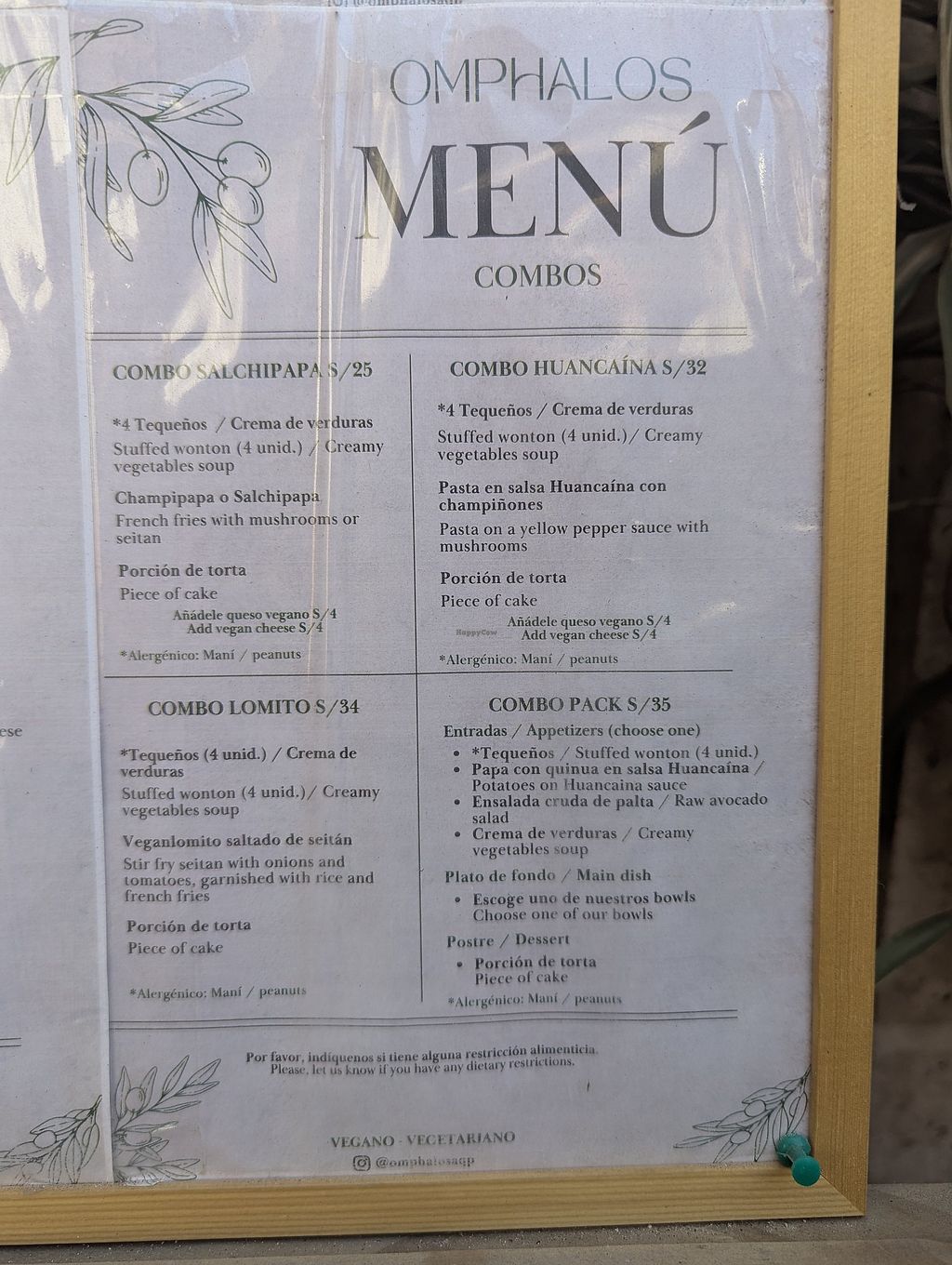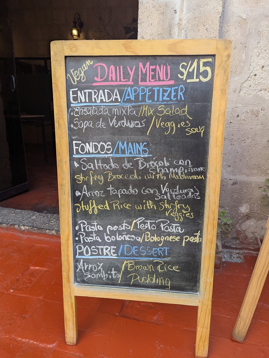 There were two menus of the day which were all vegan (one for 14 pen and one for 25 pen). We chose the cheaper one and I changed the dessert for an alfajore for 1 pen extra. The food was nothing special but for the price it was good! The staff and the location were really nice!
