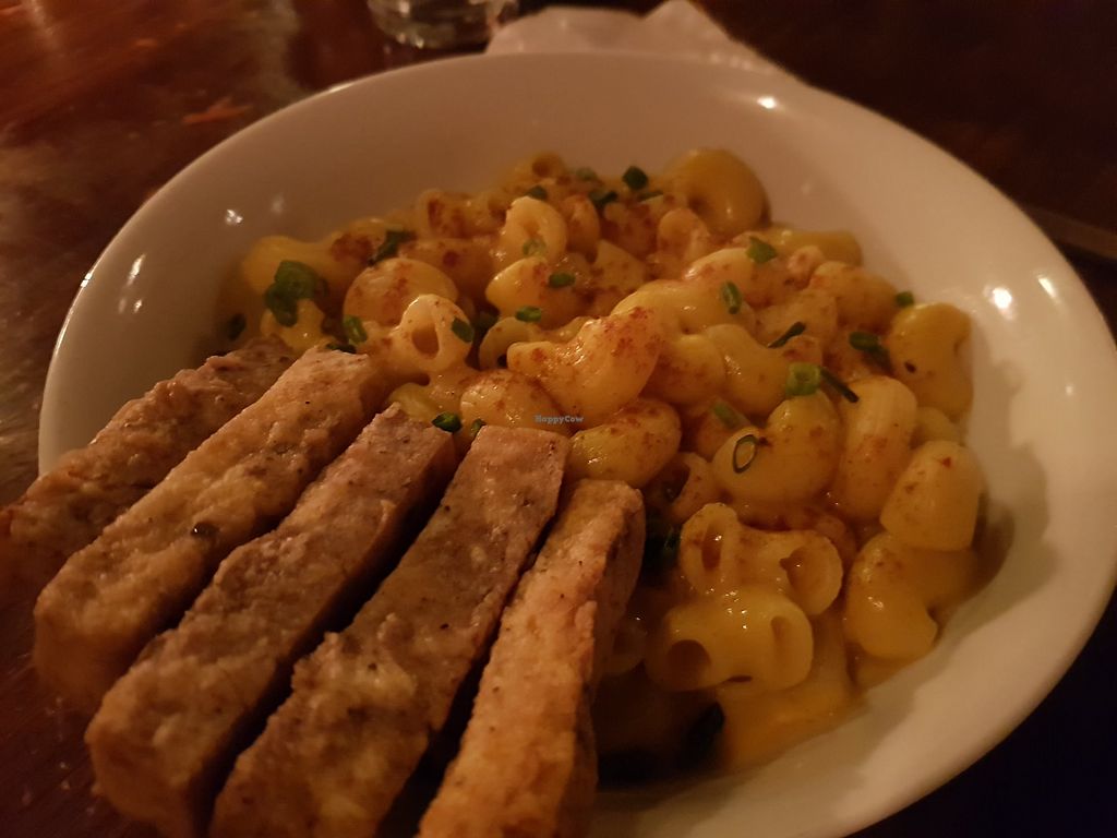 Mac and cheese with breaded tofu.