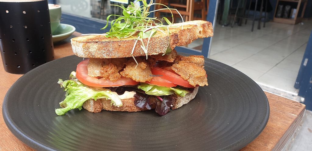 Vegan egg and tempeh bacon on toast