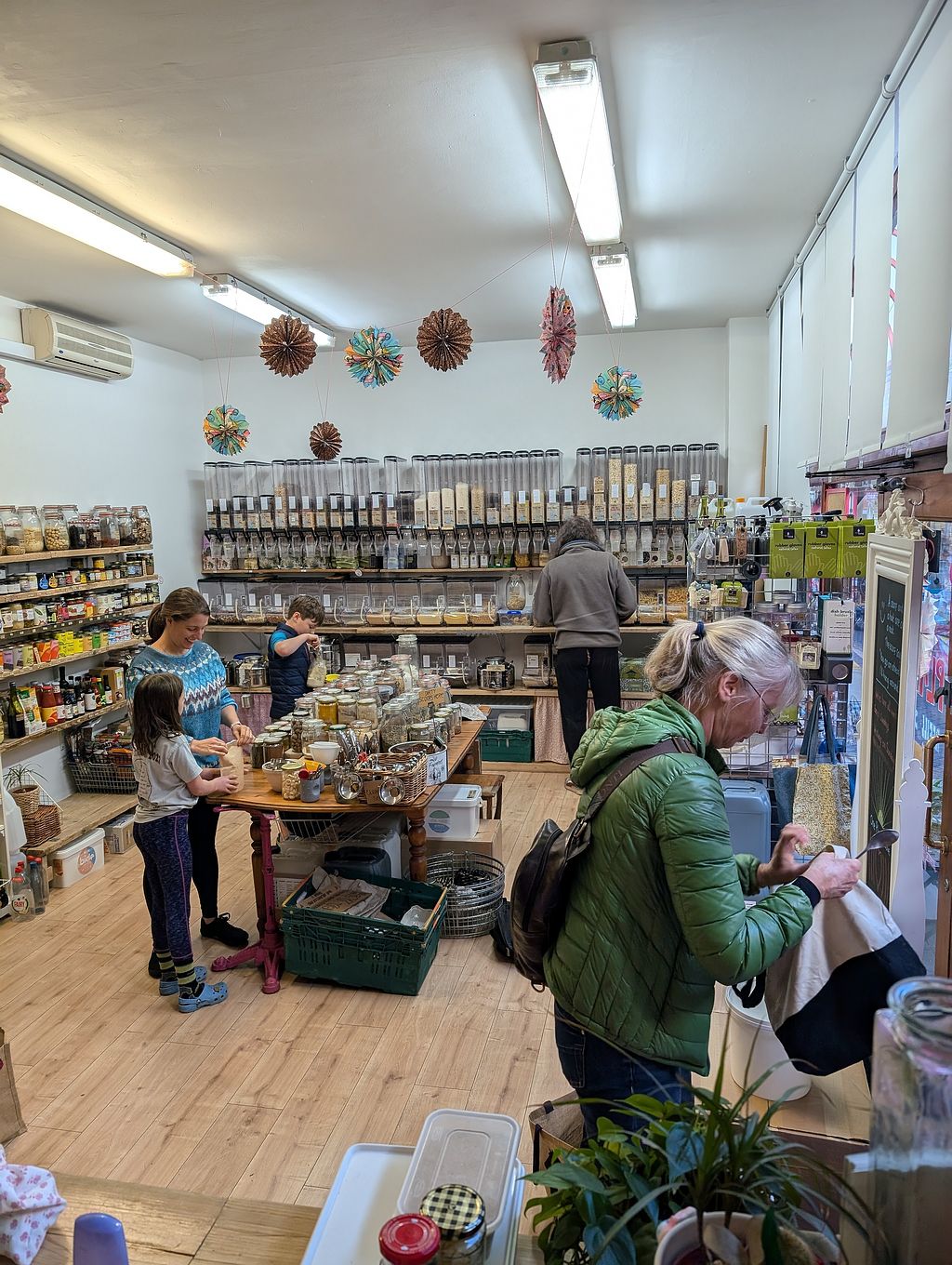 Zero waste shop with refill stations for soaps, shampoos, detergents, bulk dry food items sold loose by weight, cooking oil, and kitchen cupboard staples. Open Tue-Wed 10:00-17:00, Thu 10:00-18:00, Fri 10:00-17:00, Sat 09:00-17:00. Closed Sun.