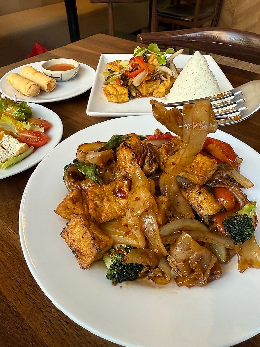 What a hidden gem! They do an affordable lunch special menu with plenty of vegan options. My favorite is Pad Kee Mao or Drunken noodle, thick chewy noodles with a kick of chili— an ultimate comfort food with an attitude—little spicy, saucy, and deeply satisfying. One bite and you'll see why it’s called "drunken noodles"—it’s wildly addictive, even without the alcohol.
