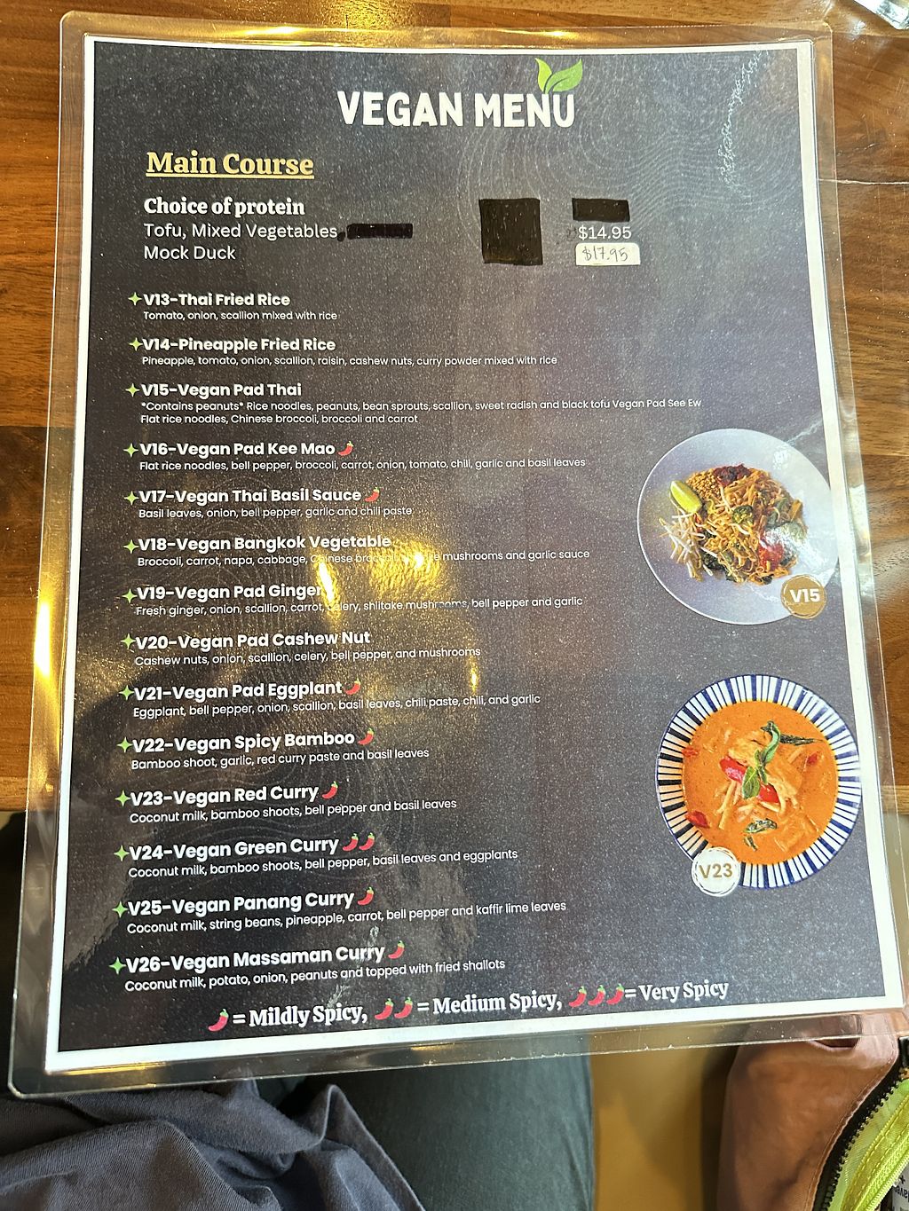 I loved I Am Thai (formerly in this spot) and so glad that the new business here (offshoot of Wondee Siam in Manhattan) decided to also offer a very plentiful dedicated vegan menu! And, the cooking is so flavorful and high quality! The IRL menu for dine in doesn’t have the vegan options labeled yet, but the website and online menu on Google Maps both do. The warm and friendly server also was eager to clarify which dishes can and can’t be made vegan. When the order is rung up, a dedicated vegan flag is input (printed on receipt) so they’re def taking care! Vegan protein options include tofu and mock duck. Highlights: Roti Massaman, Pad Thai, Sautéed Eggplant, Pad Se-ew (really good wok hei mmm), Penang Curry.