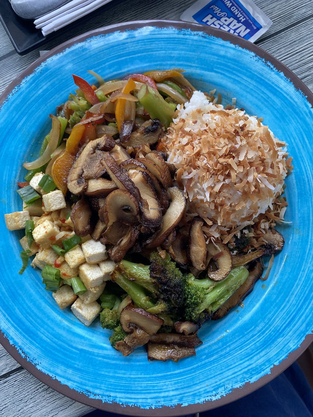 Nice Hawaiian styled atmosphere. Great prices and some vegan options. Food was tasty. Knowledgeable staff but ask for JP if he is there. Coconut rice. Tofu dish. Grilled veggies. Can’t complain as there are limited choices in the area