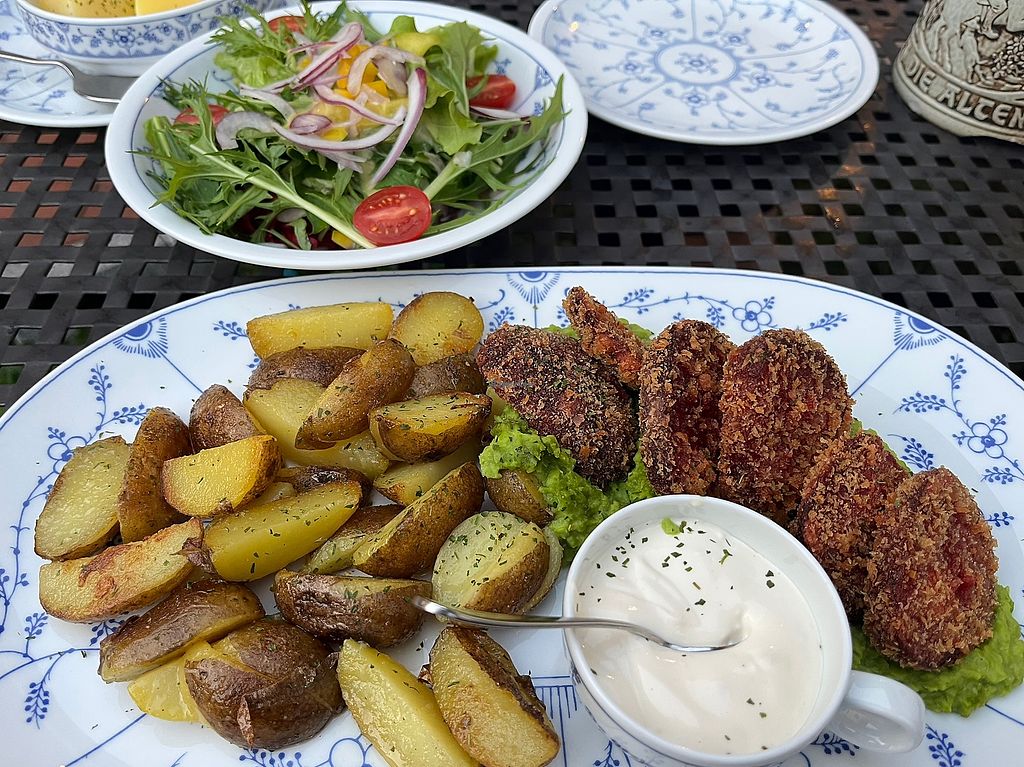 Erbsenpüree mit Rote-Beete-Schnitzel und getrüffelten Kartoffeln