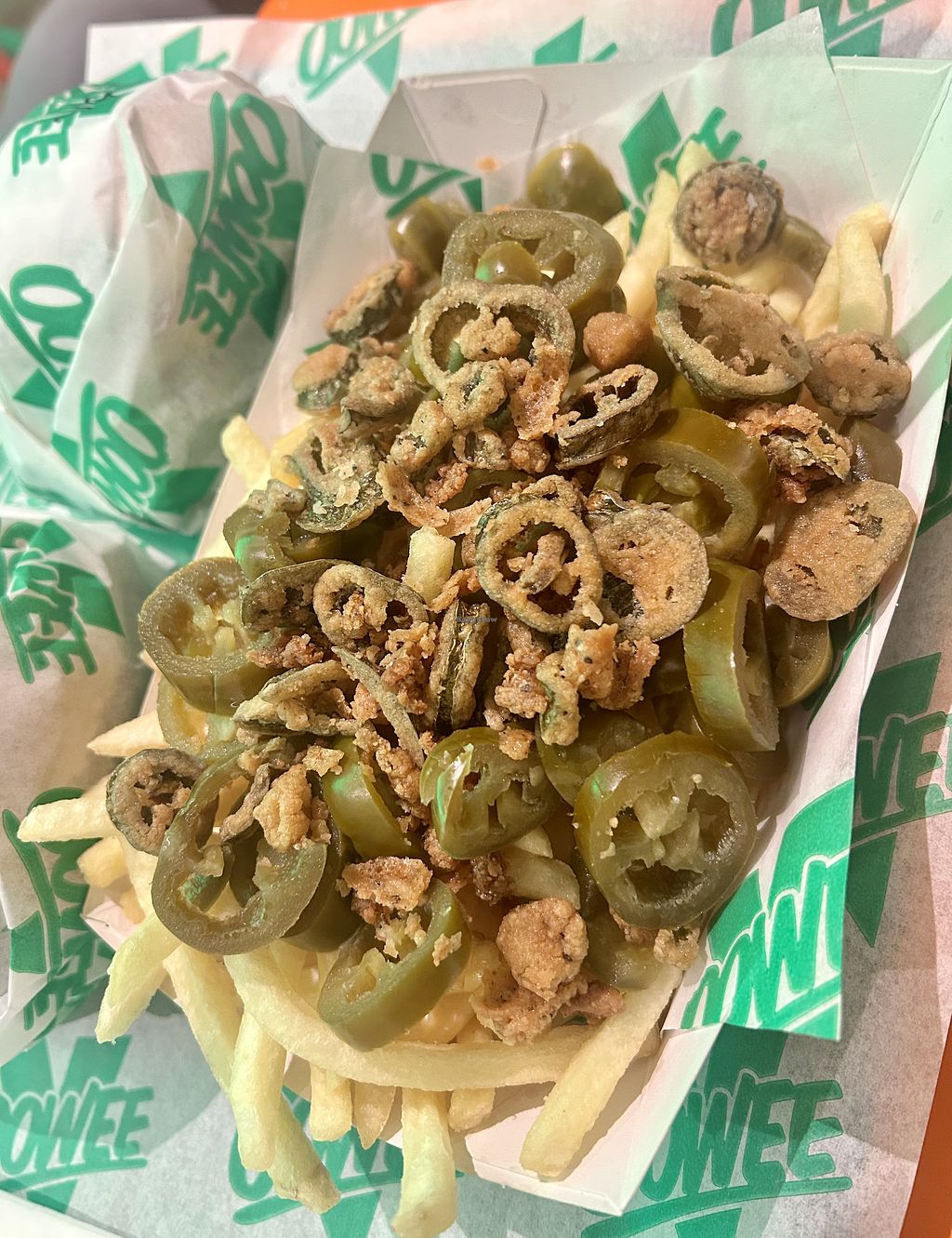 Sneaky clucker & fries, cheeze sauce and loaded chick'n waffle fries