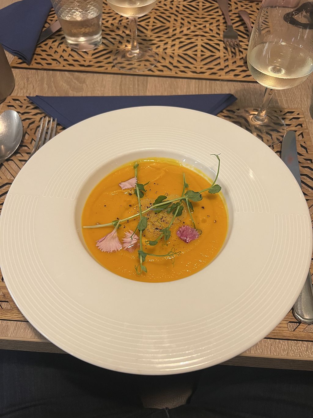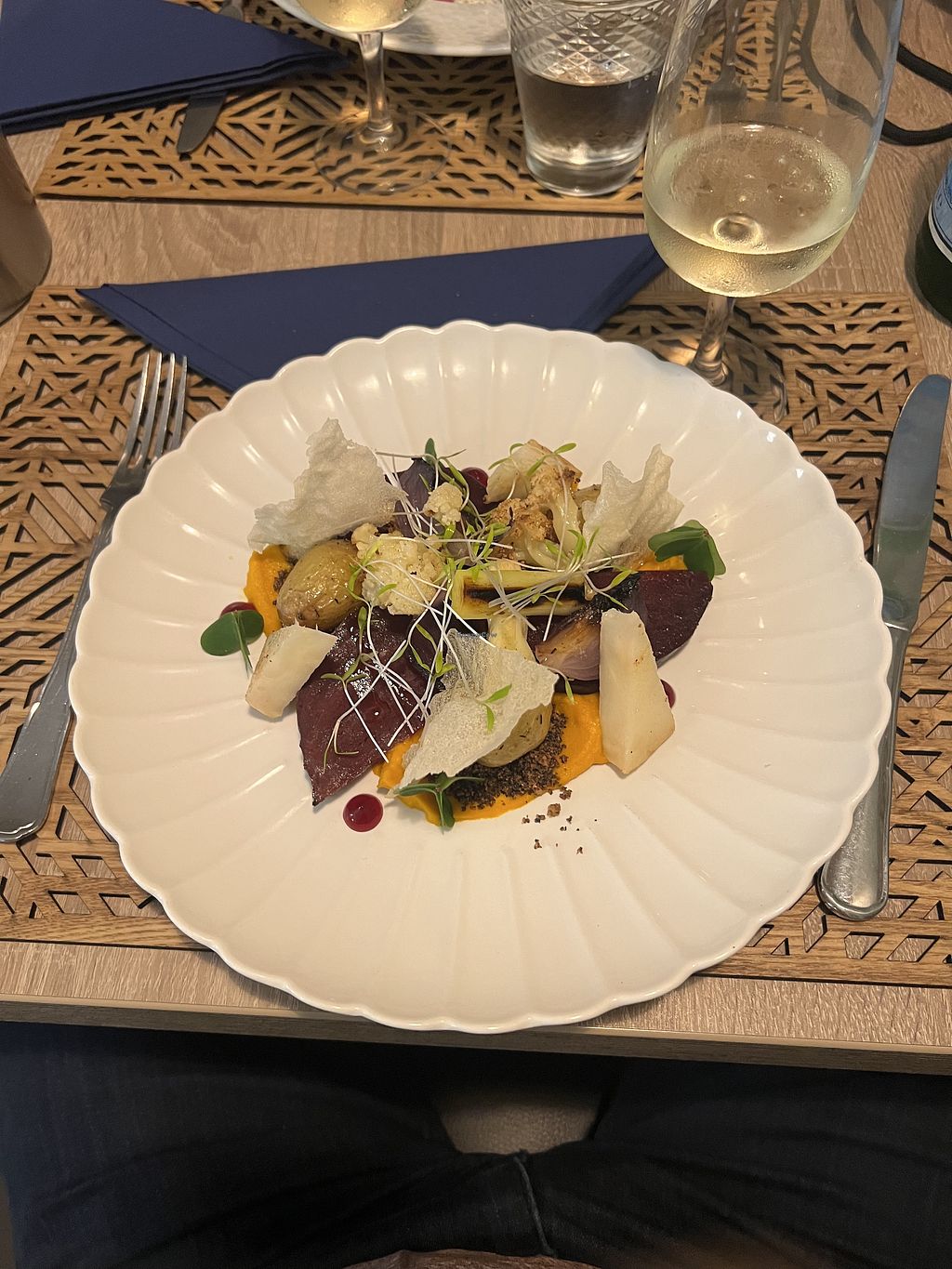 The menu rotates seasonally but when I visited (Oct/Nov 2022) their three course tasting menu was not vegan and could not be modified. The starter had cream already mixed in and the dessert was not vegan. As a result I could only have a plat principal, and there was only one choice. The dish, a mixed roasted veggie plate, was delicious but sparse. They did offer a very nice chestnut soup shooter as a digestive, which they made sure to tell me had no cream and was vegan (other tables seemed to have the same soup with cream on top).