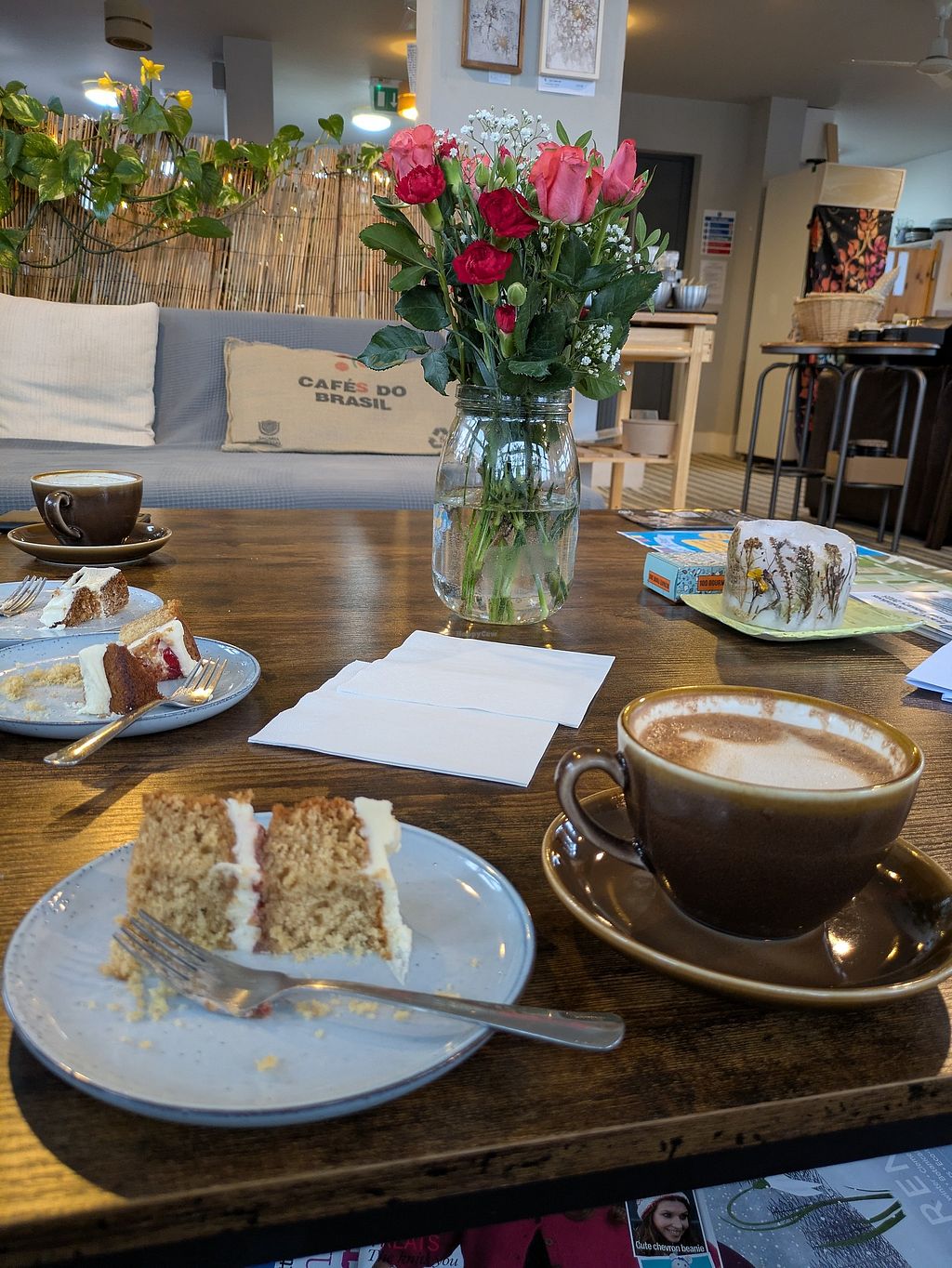 Tasty vegan victoria sponge, plant based milk options, nice chilled vibe inside