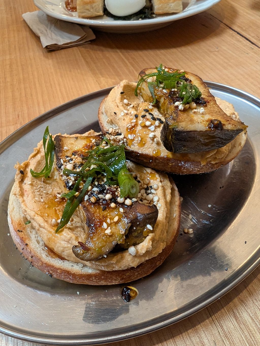 The mushroom bagel, featured 1 large king brown mushroom with a ponzu caramel, on a thick bed of nduja cashew cream garnished with chilli oil and shallot.