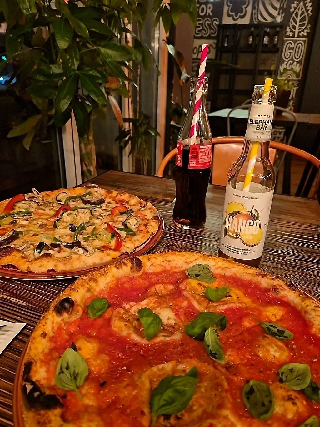 Mehrere vegane Pizzen und Burger auf der Karte zur Auswahl.