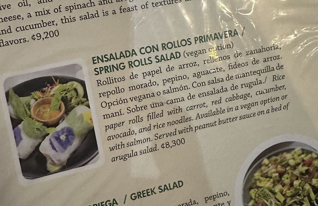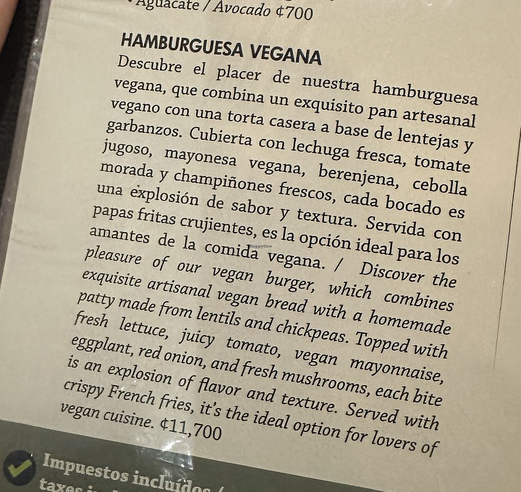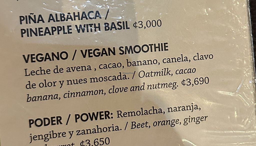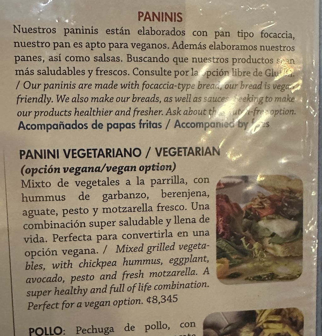 We had an Americano with almond milk and the vegetarian panini without mozzarella. The panini comes with a salad, potatoes or a soup for 5600 Colones. It was really good, although a little pricy. The vegan options are all clearly labeled.