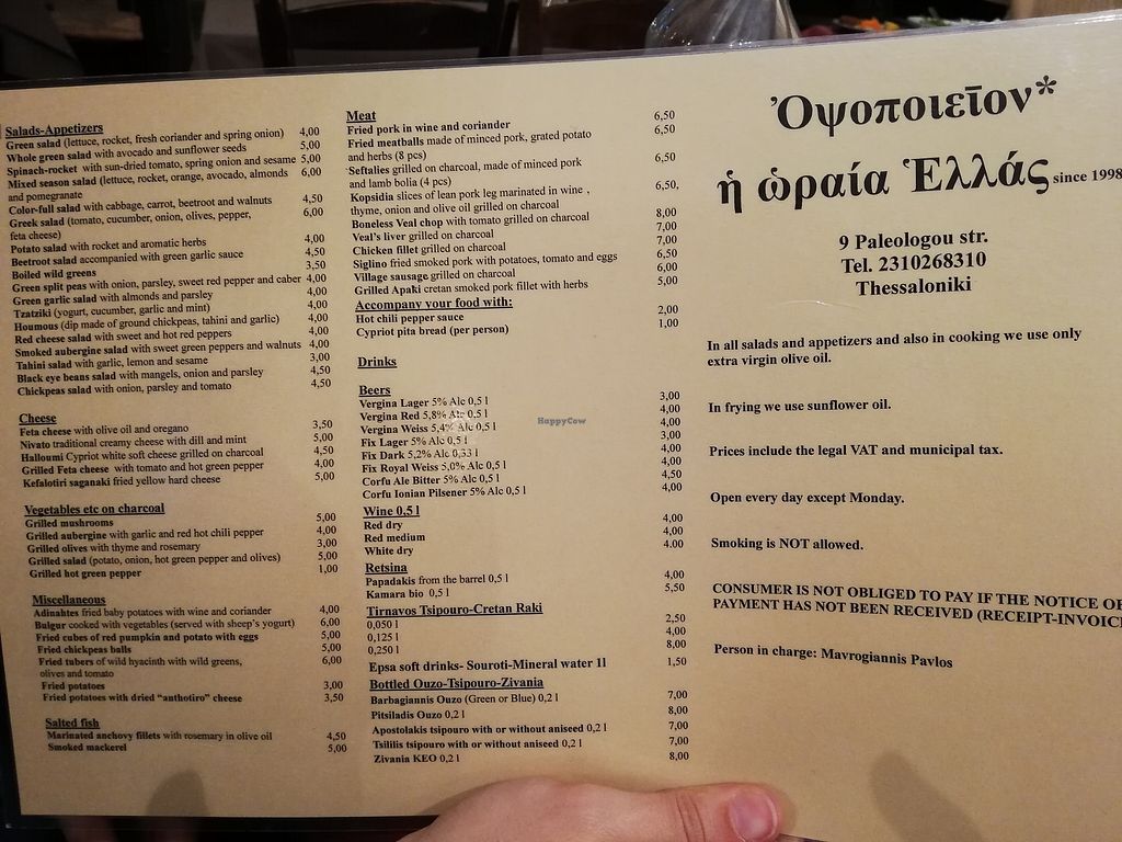 I'm so pleased Happy Cow pointed us in the direction of this place. We'd probably never even have passed it otherwise, as it's on a quiet side street which didn't look to have much going on. The menu is provided in English as well as Greek, and although veggie/vegan options aren't marked, the item descriptions are clear so you can get a good idea before asking. We told one of the women in charge that we were vegan and she recommended some dishes (clarifying no yoghurt/cheese). We pretty much left the selection to her and were not disappointed. We had a great selection of dips, a black eyed bean salad, a bulgur wheat dish and an amazing falafal-like dish of fried hyacinth tubers - a new one on me, but something I'd love to eat again. It was very reasonably priced and such lovely service. Recommended!
