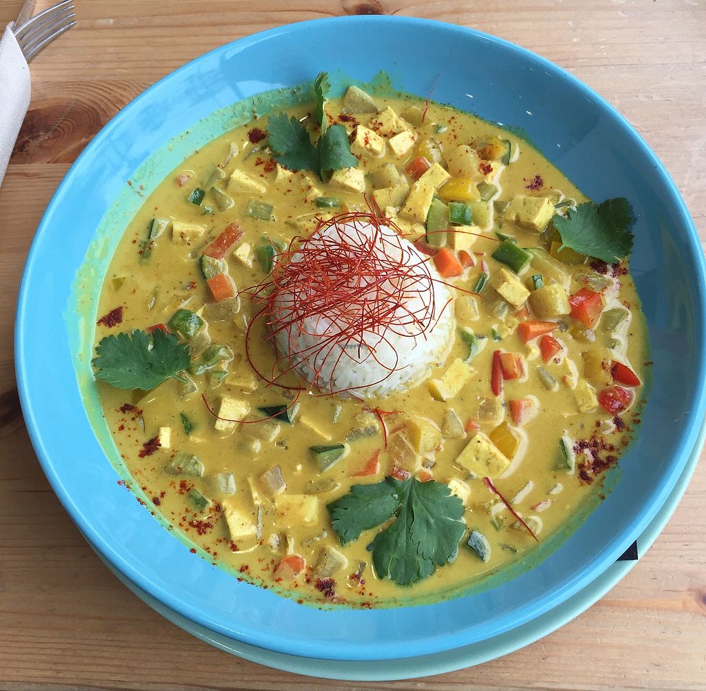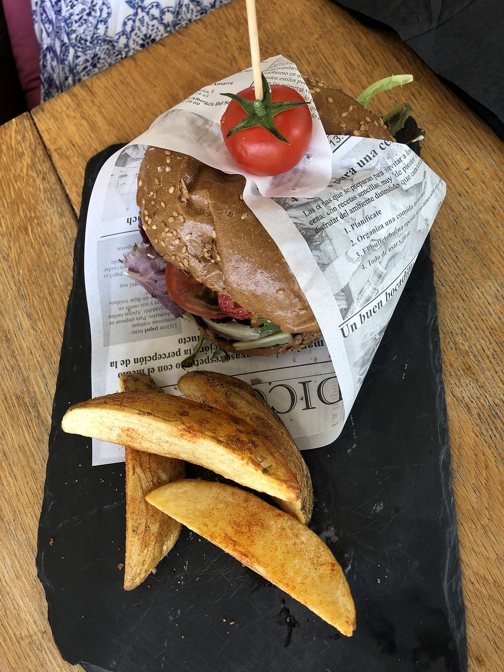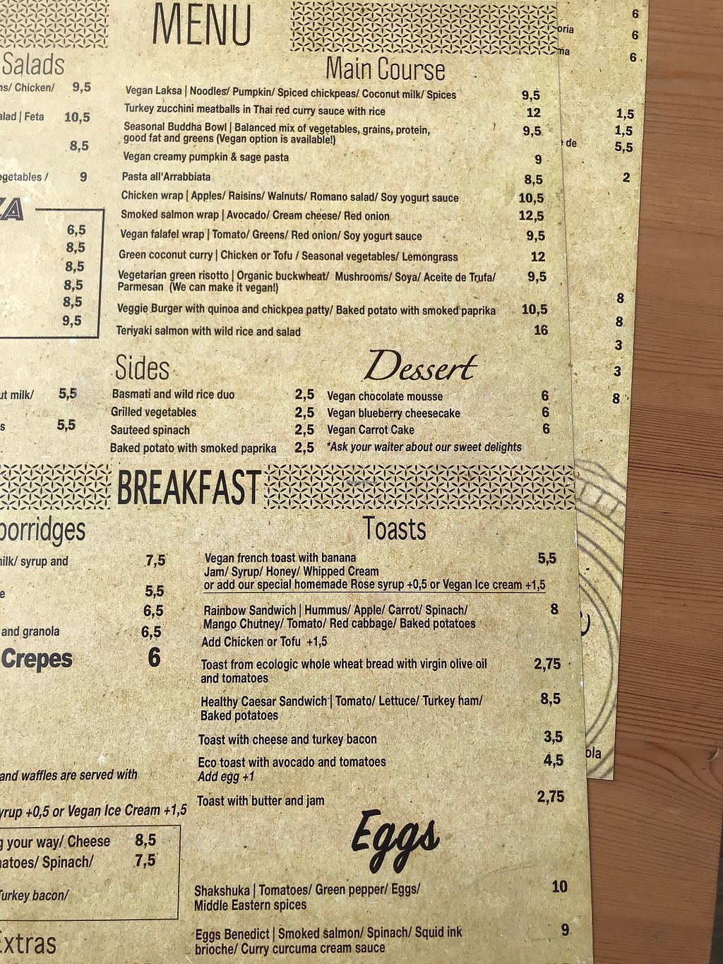 A lot of vegan options. We had the veggie burger, hummus, carrot cake and pumpkin pancakes. All delicious. Very nice presentation. Prices are very reasonable: we were with 4 who took a main dish and dessert plus drinks and payed 59 euro or around 12 euro per person.