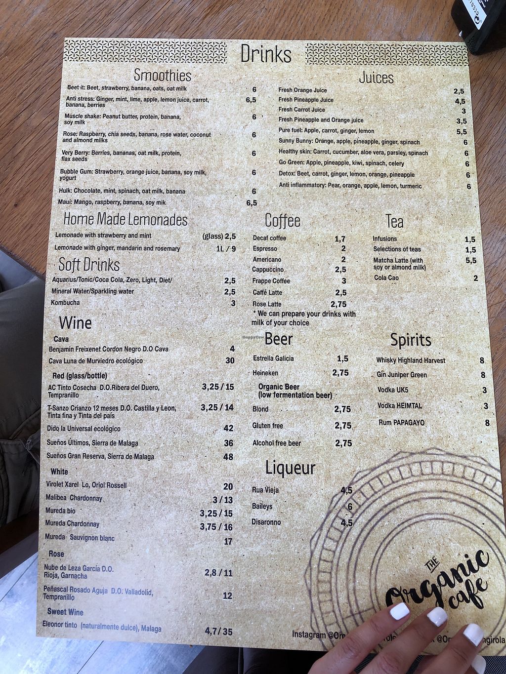 Organic Cafe saved our Fuengirola holiday :) They had such a nice menu with plenty of vegan options. It would have been frustrating to try to find any good places for breakfast or other restaurants, that would be open when we were hungry. Organic Cafe opened at 9 am and we were there right then every morning. They were open until 9 pm, but at least last Monday the kitchen closed already well before 8 pm, so you need to come for dinner early enough, at least in winter.