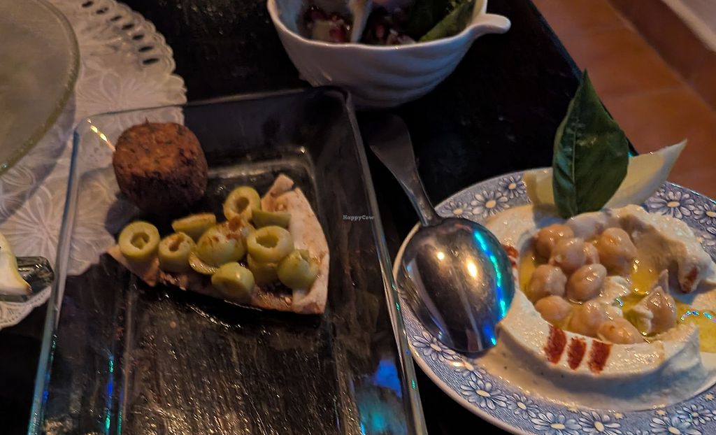 Our server really knew what vegan is. He recommended the tasting menu with modifications to make it vegan. There was pita bread, hummus, babba ganoush, tabbouleh, fatoush salad, the best kalamata olives we've ever had, 2 pita wedges with a delicious olive tapenade, and the best falafel we've ever had. The entree was beautifully seasoned, grilled veggies. For dessert, there were dates stuffed with peanut butter and topped with coconut. Everything was really delicious and 100% vegan!