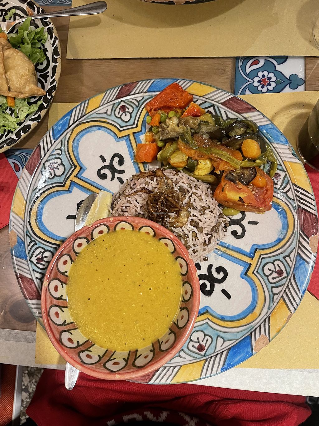 Dahl , Samosa , veggie curry , eggplant and rice pictured