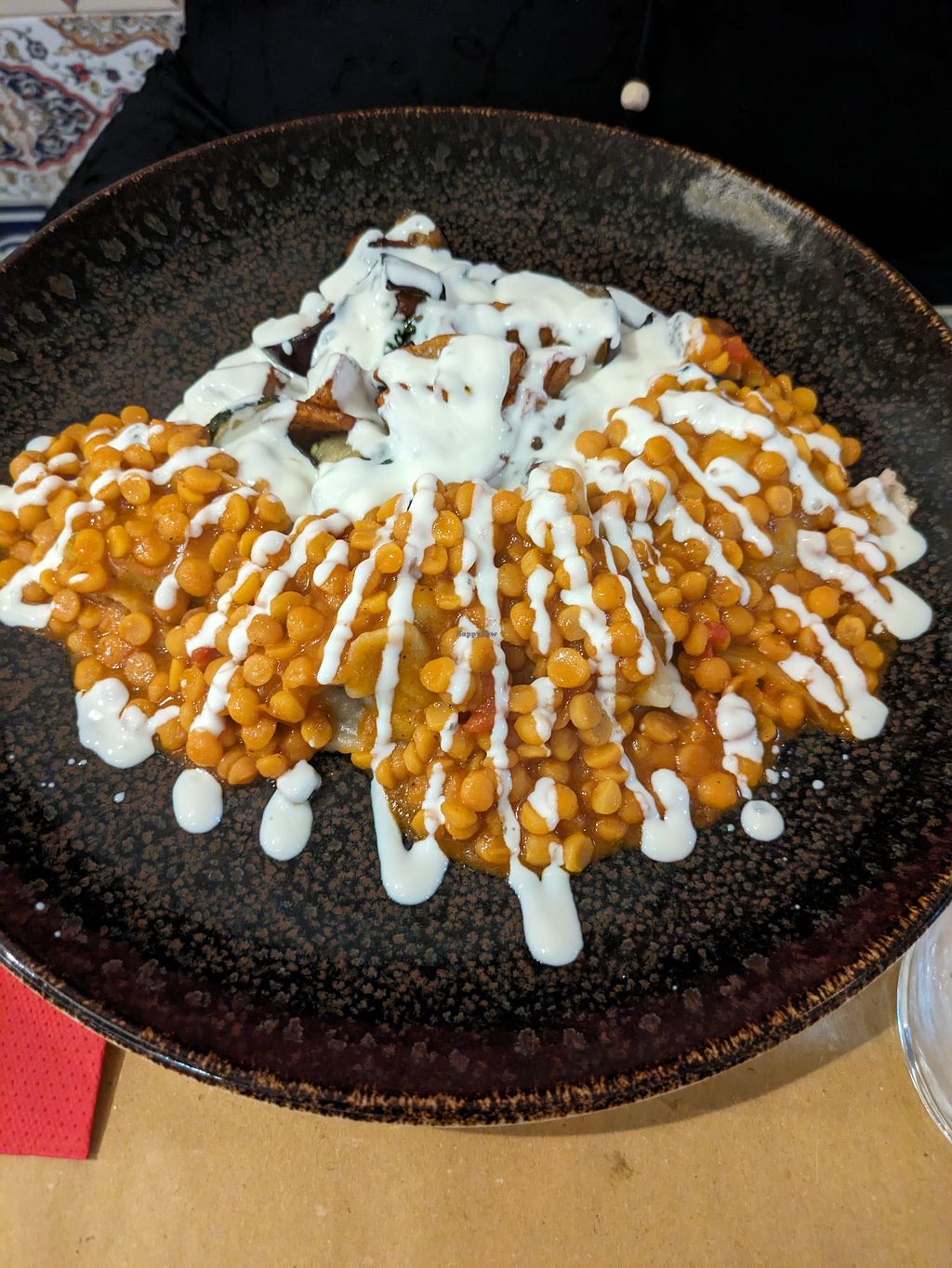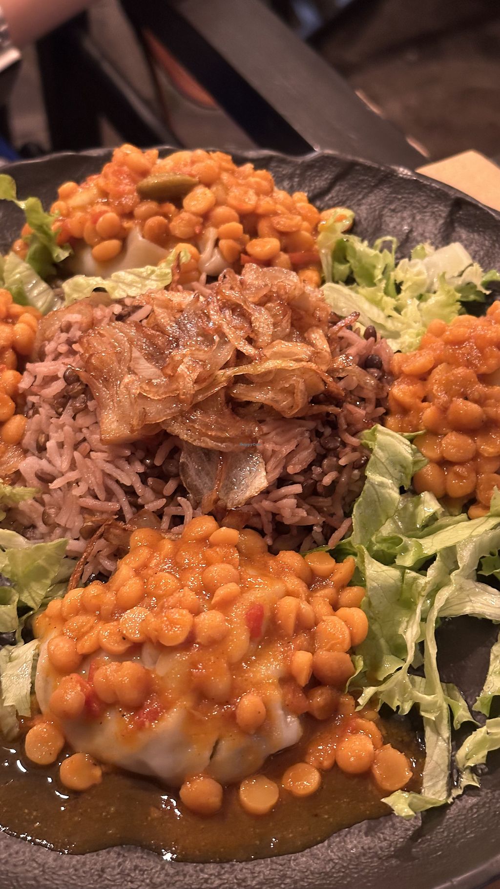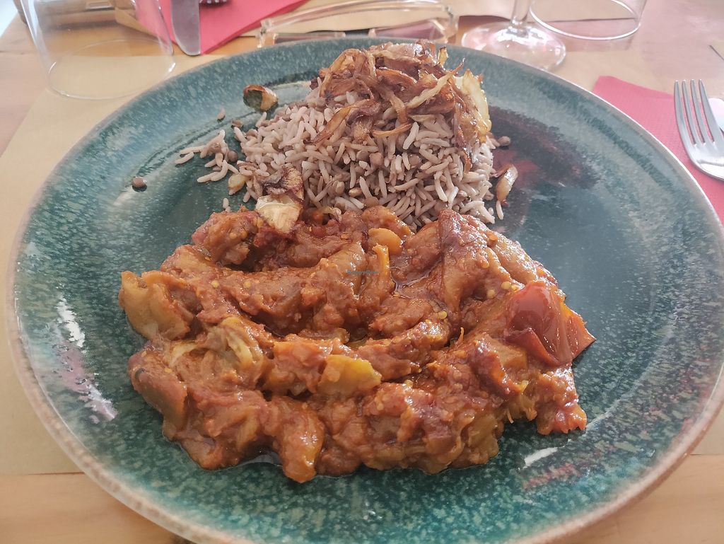 Eggplant stew with lentil caramelized onion rice