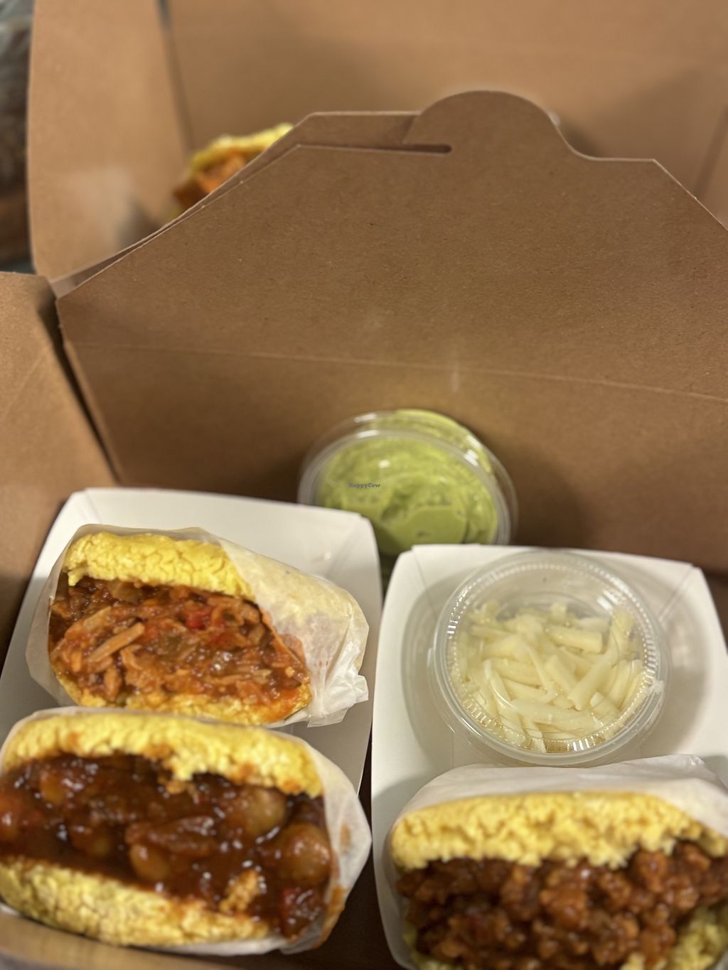 Arepas Jackfruit, black bean , chickpeas and ground meat with red lent…