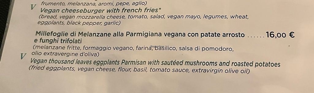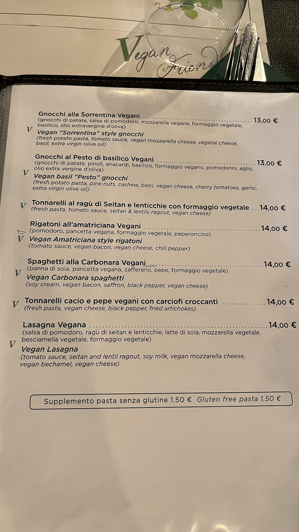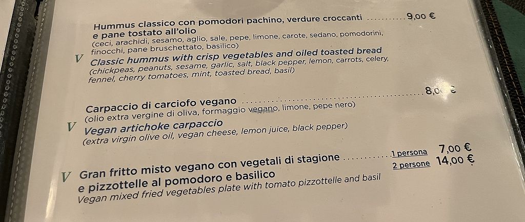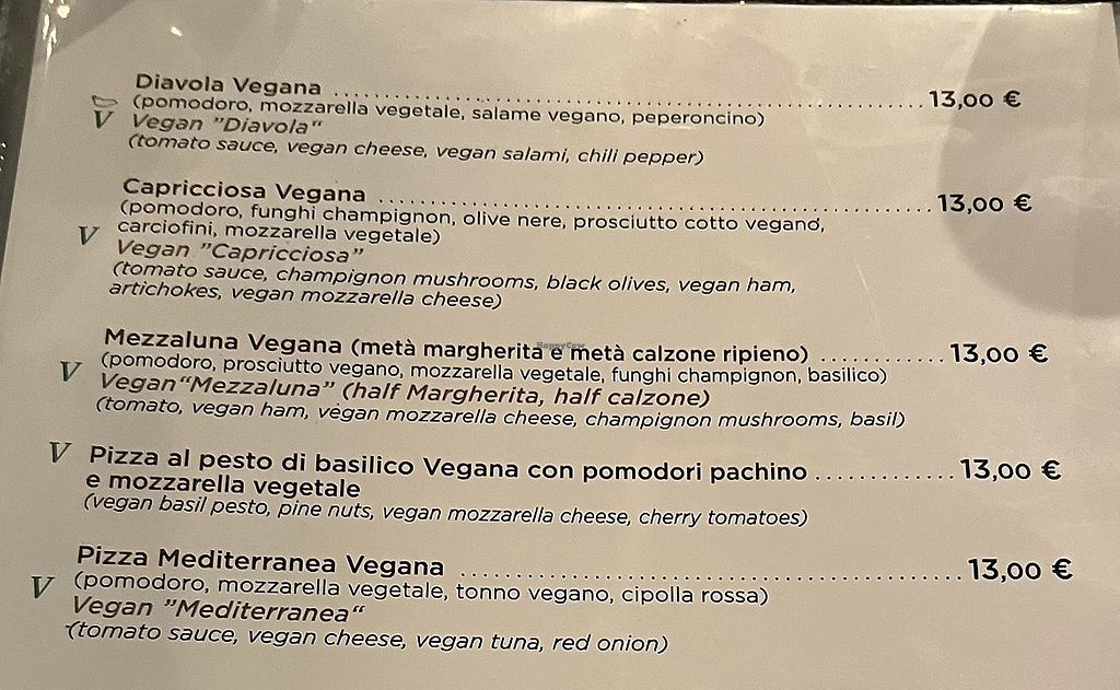 We’ve had much better pizza there than in some other (fully vegan) places in Rome. We’ve had pizza diavola and capricciosa. Both were excellent, delicious and even the vegan mozzarella and salami were very tasty (not the usual non quality coco fat cheese we usually get on vegan pizza). I sincerely recommend visiting this place. The stuff is very helpful and vegan dishes are clearly labelled. There are vegan choices of antipasti, primi, secondi and even desserts.