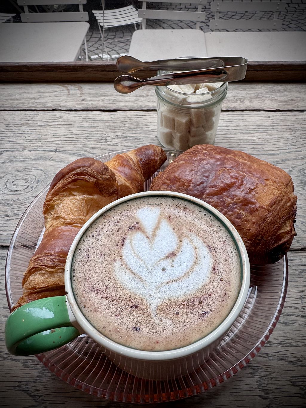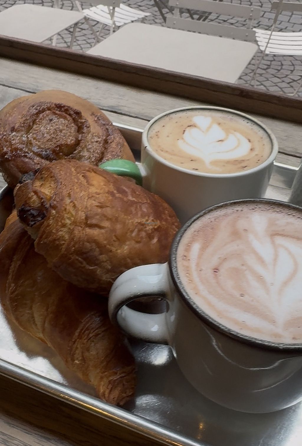 I enjoyed a delicious breakfast of a croissant, pain au chocolat, hot chocolate made with oat milk, and orange juice.