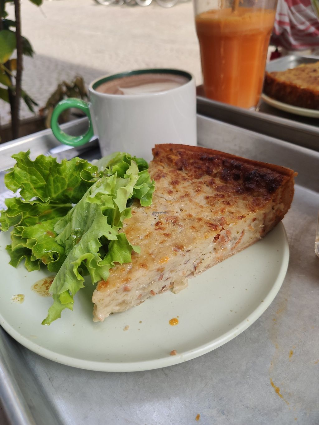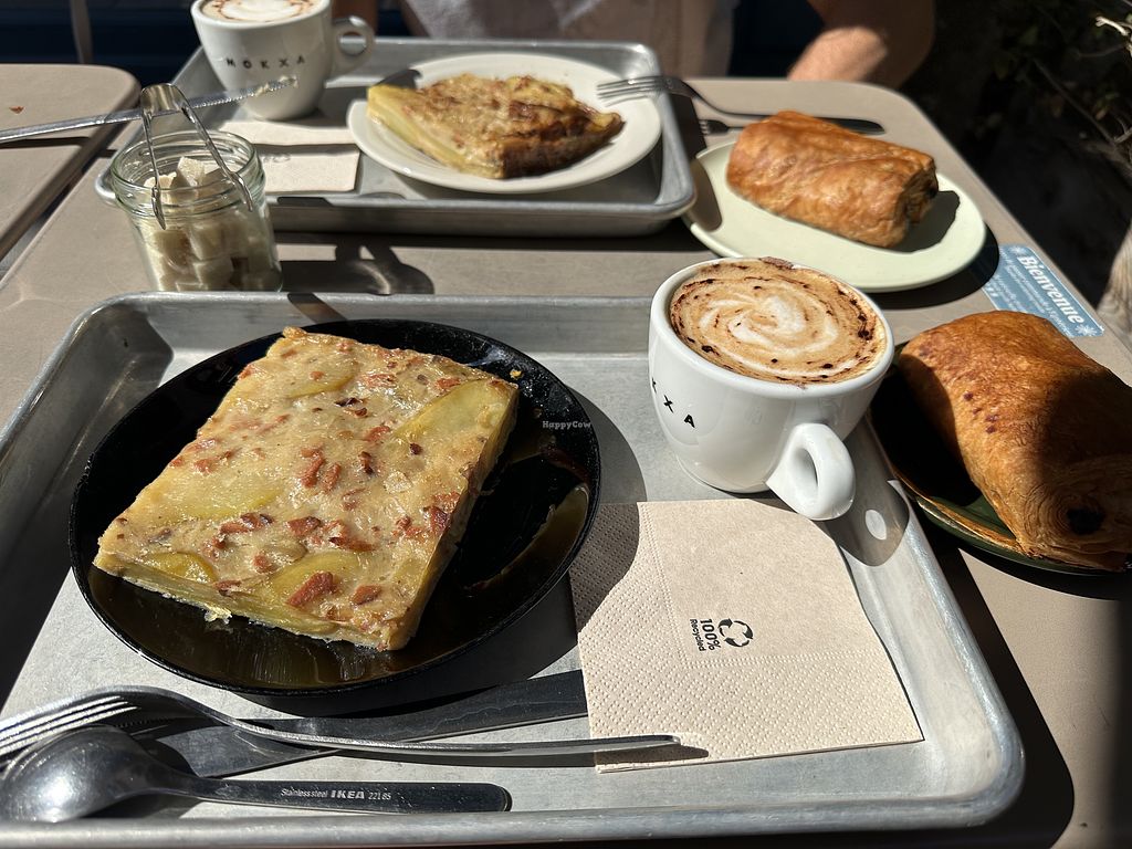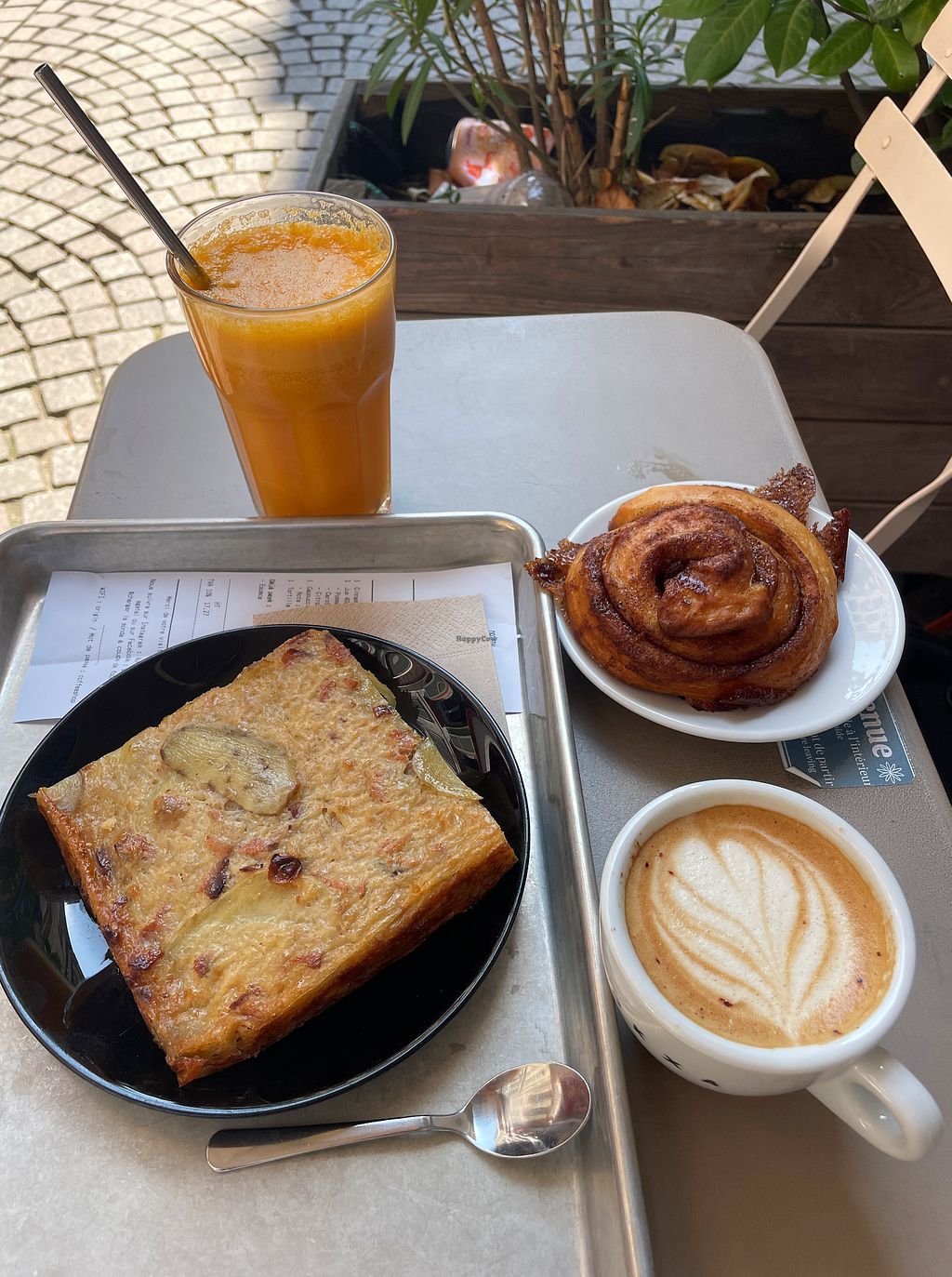 tortilla, cinnamon roll, carrot-apple juice and cappuccino