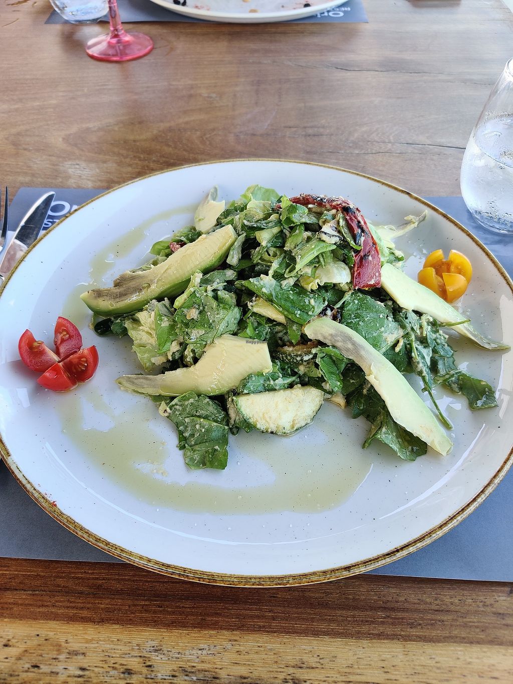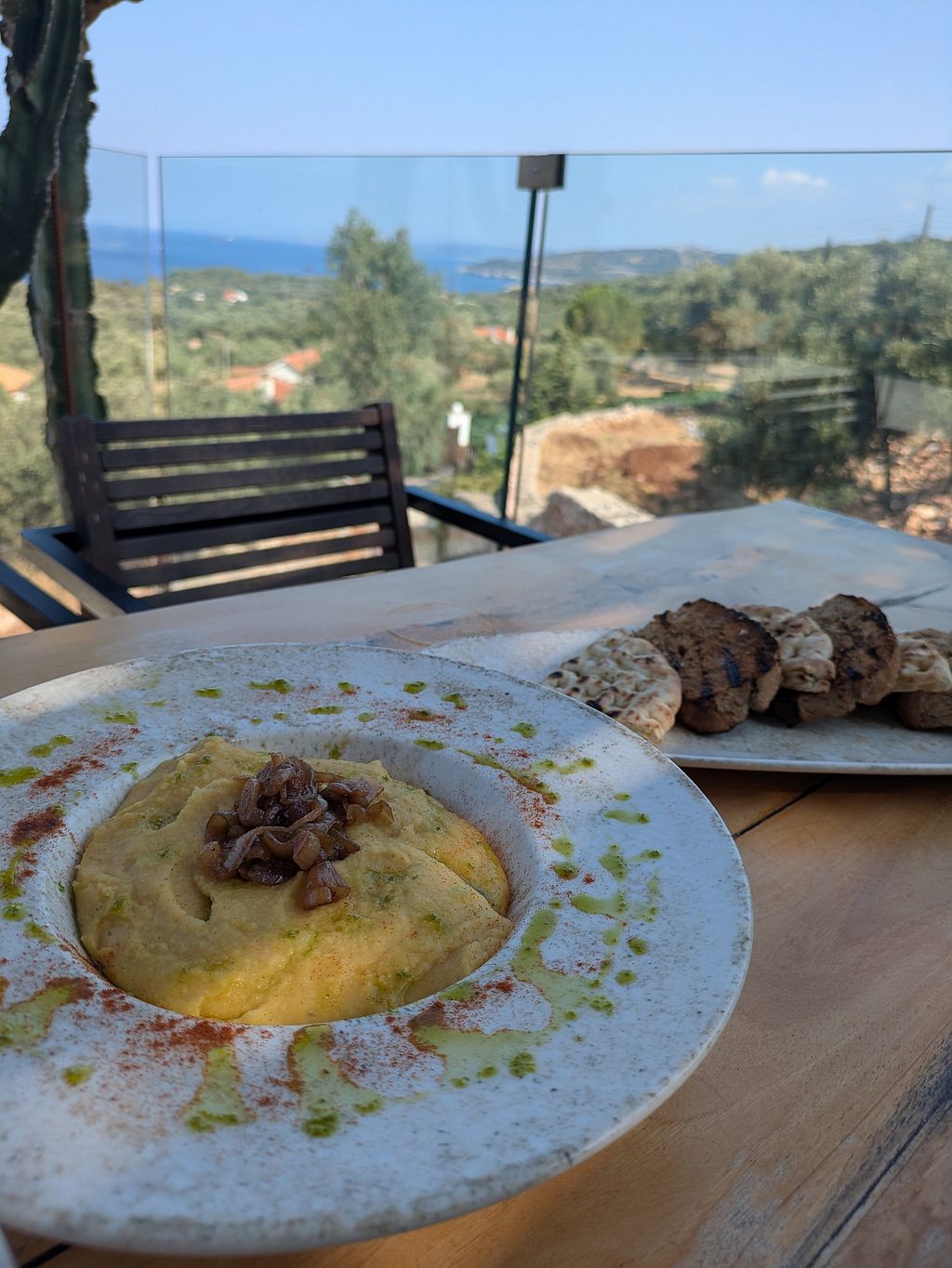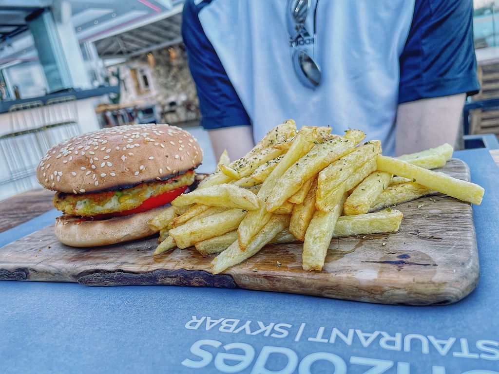 A very elegant place with a beautiful view. And that's the biggest advantage, because the menu offers nothing special. The food is tasty, but for me it is important that the meal contains protein and is varied. I ate a burger because it seemed to be the most filling meal. And it disappointed me a bit that hummus and (I think) pesto are both burger sauce and fries sauce. The bun, on the other hand, seems to be a supermarket bun. I do not discourage you from visiting this place, because there is no other place in the area. But there's really nothing to go there. Prices very high too - a bottle of water for 6 euros!