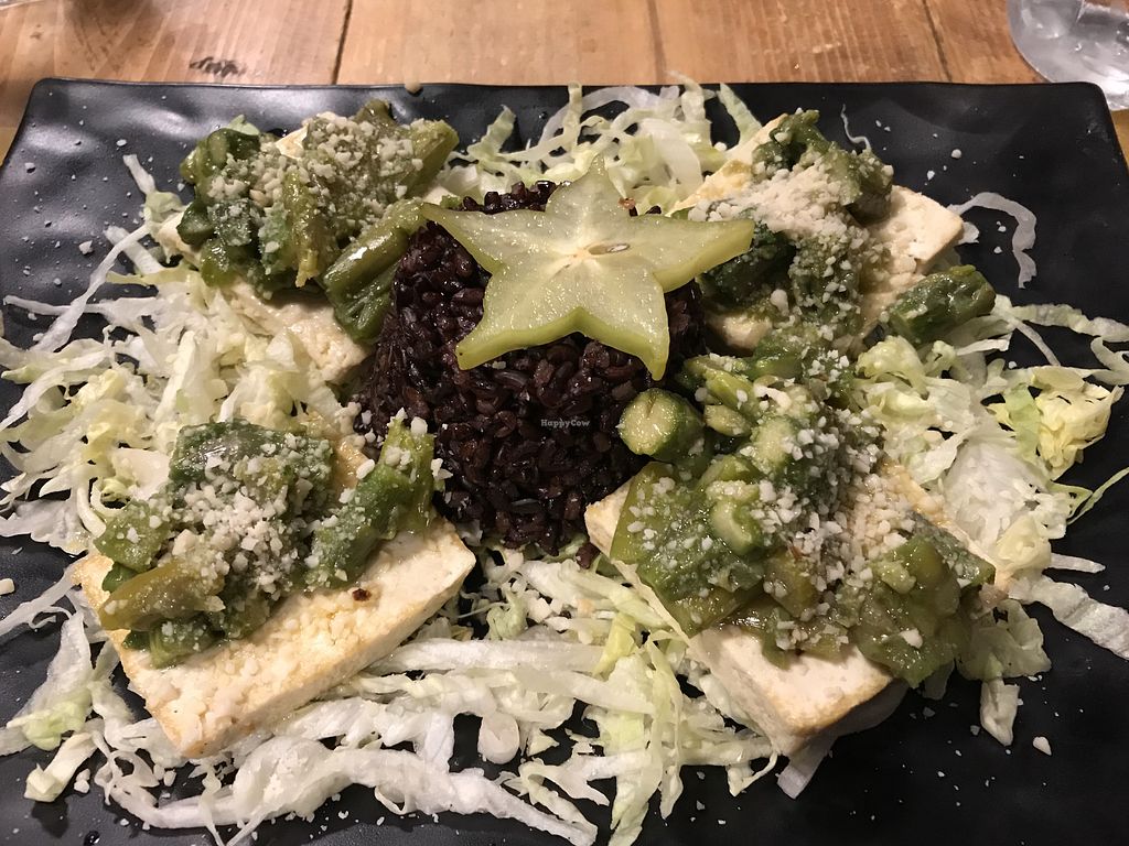 I just ate a delicious vegan dish of hummus which came with cooked radicchio, raw starfruit and toasted bread 🍞 with sesame seeds. I also enjoyed a hot red fruit tea. The service was friendly and fast! The decoration inside the restaurant is creative art, they have very high ceilings which create a majestic ambiente. The lights are soft with a warm color and they play vocal music. They offer space for atleast 50 humans. See you again soon!