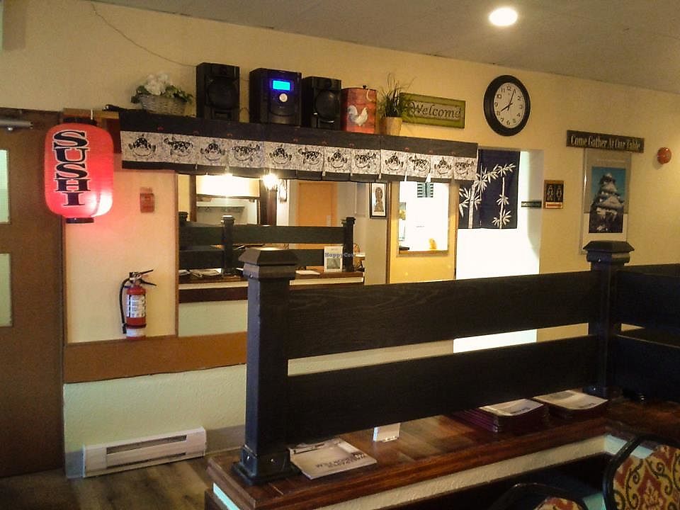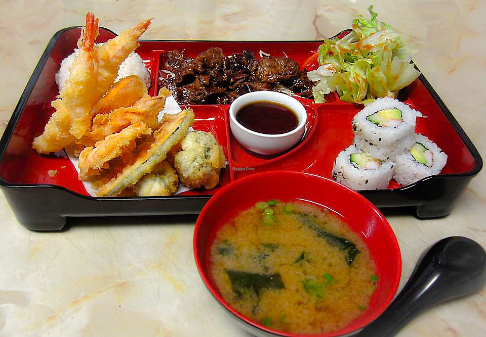 Serves meat, vegan options available. Family owned restaurant making standard Japanese food but can modify dishes for vegans, where possible: for instance ask for a vegetable or tofu donburi. The seaweed salad, green salad with sesame miso dressing, avocado roll, and mail roll are vegan, but the vegetable tempura is not. Reported closed, Jan 2021.