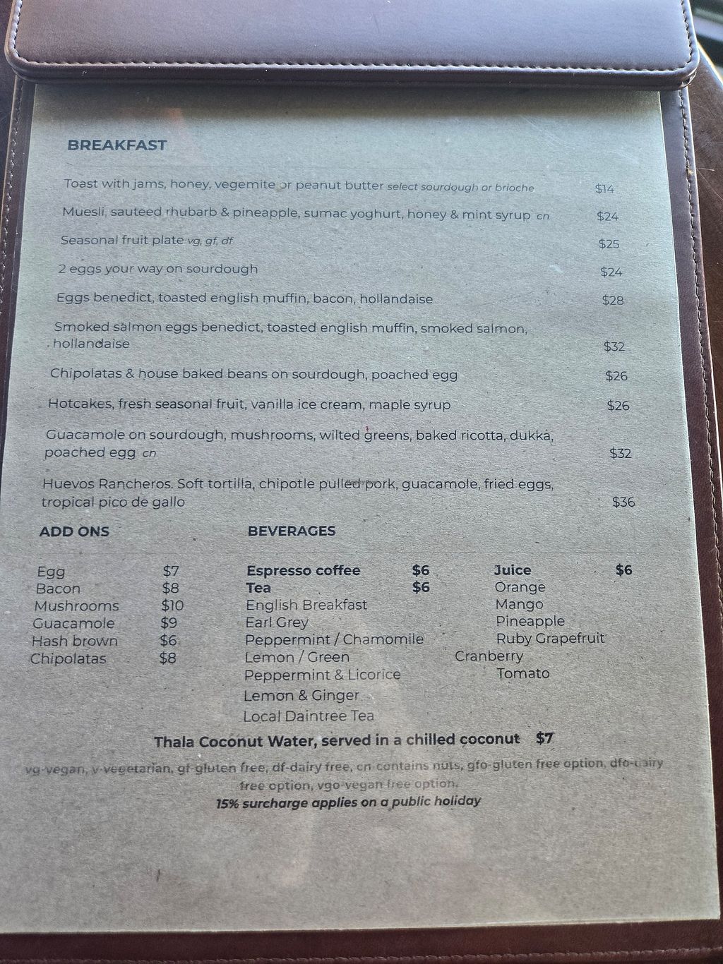 Truthfully, expectations were higher for this restaurant. They have the same menu for lunch and dinner, with a noodle salad and a risotto. Both of which you need to specify vegan, otherwise it may come with butter or something else. No vegan menu. For breakfast as well, only the toast with condiments and hashbrowns are easily vegan (must specify no butter for toast), otherwise substitutions must be made. The staff are generally uncertain about vegan options and go to ask the chef (which is nice rather than assuming). Prices are also higher than we're used to/what we would normally pay elsewhere for the same dishes. Views are spectacular so that was a saving grace for this restaurant. If you are staying at the hotel, the only other restaurants close by are by van/taxi that you must pre-arrange, or bring your own vehicle to travel to Port Douglas.
