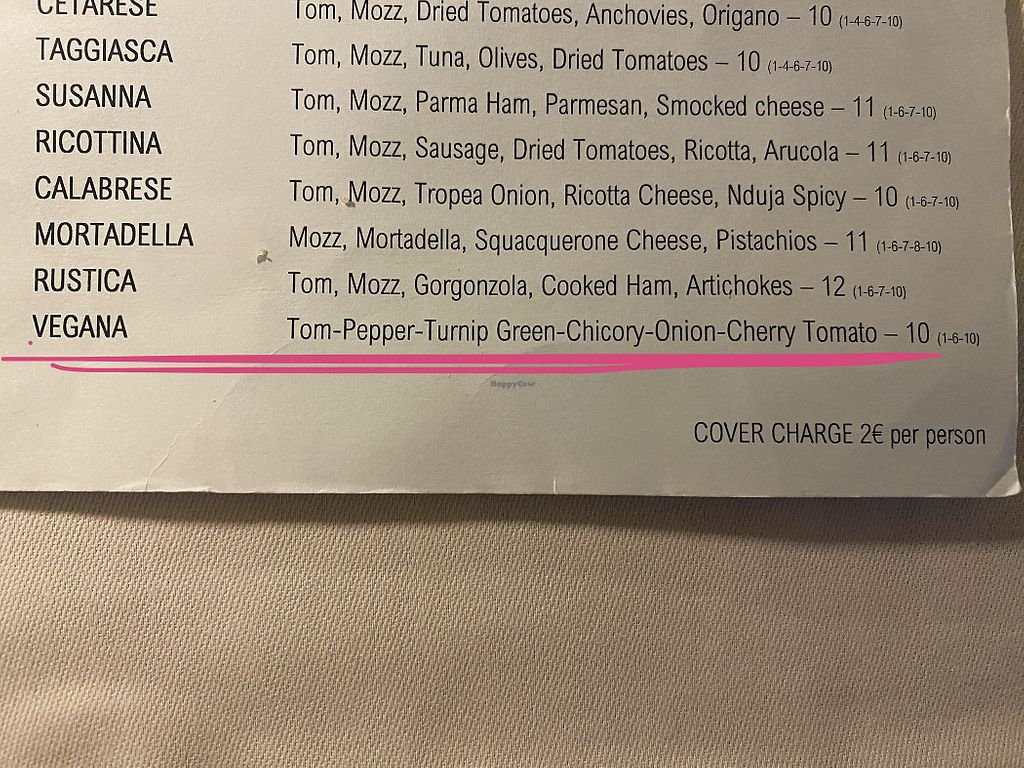 one vegan option is listed and the vegetables on it are exquisite! some of the sweetest cherry tomatoes and peppers i’ve ever had. there is also a marinara pizza and a few vegetarian pizzas that can be made vegan without the cheese😄