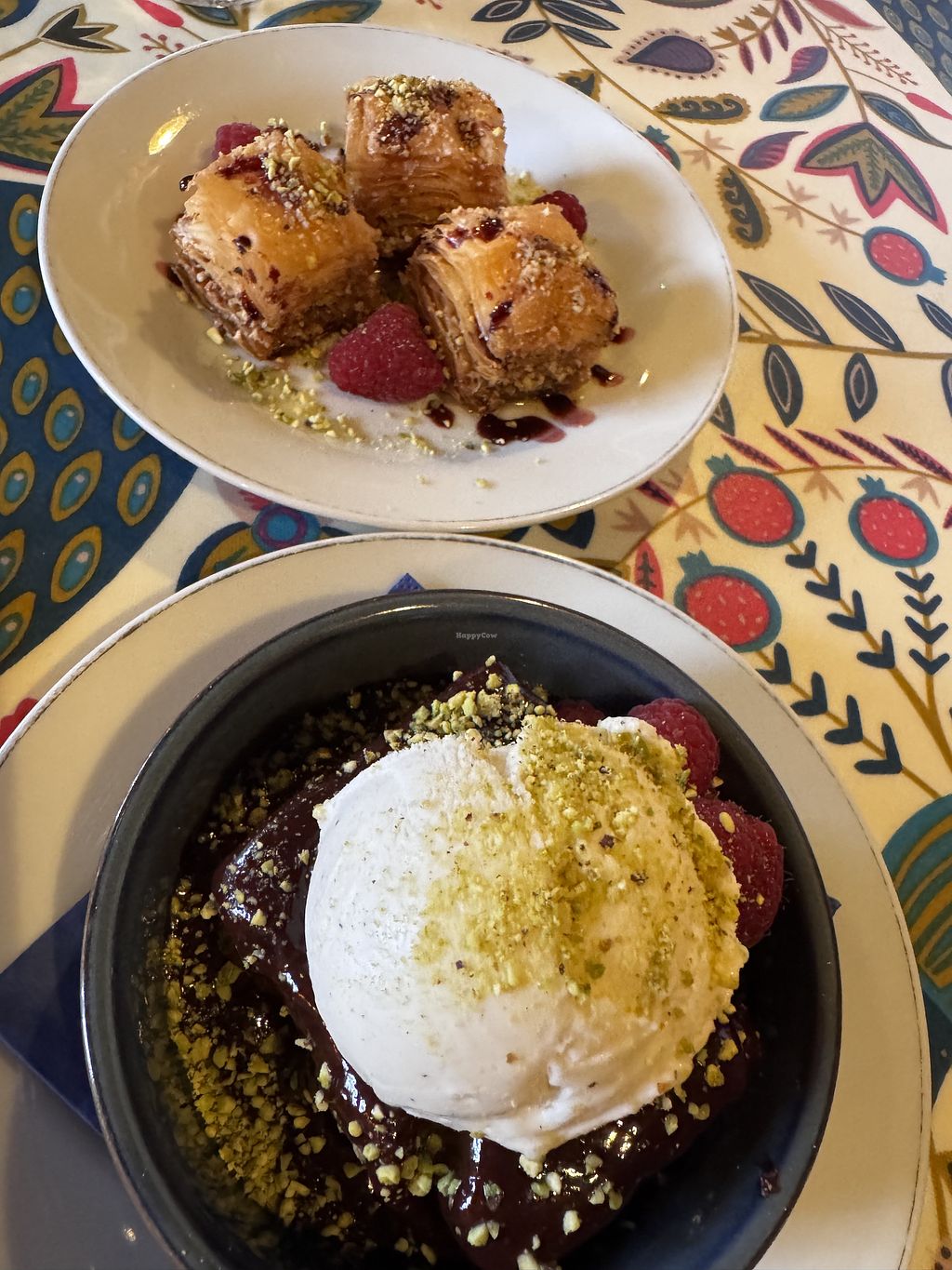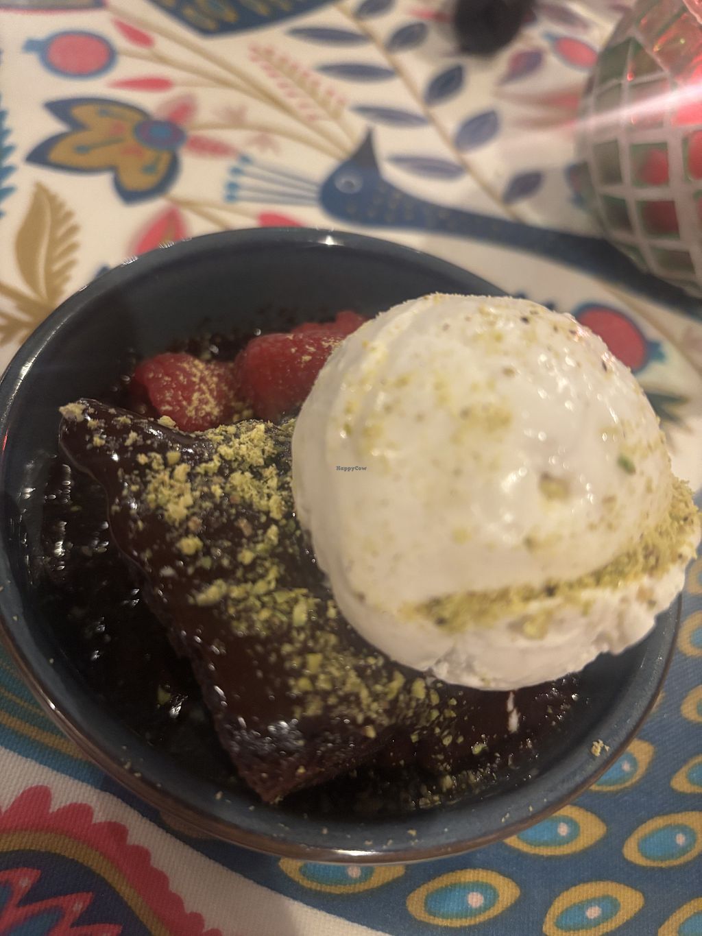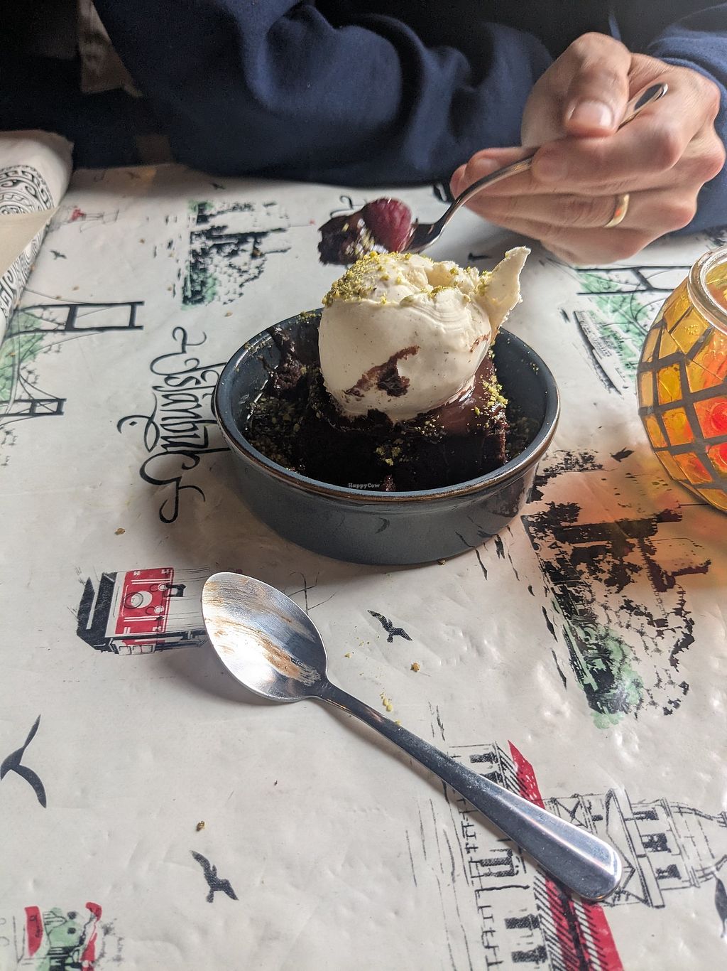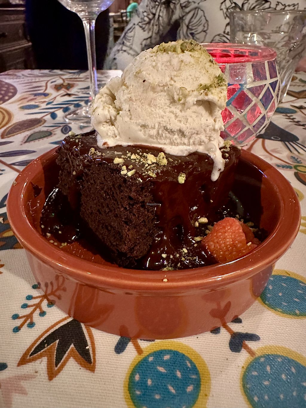 Had the mezze platter to start, with kebab for main, which was beyond meat crafted on the spit (pictured). The desserts were otherworldly, with a sweet potato chocolate mousse with cream and pistachio topping, and a Supangle chocolate cake with ice cream. 100% vegan will be going again as the menu is big! #Veganuary