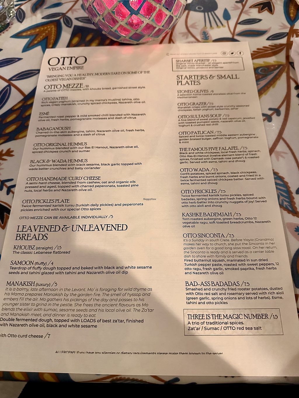 Had a lovely meal here. Tried the Otto meze for starter which was really nice way to try a few dishes. Then kebab which was a beyond meat style kebab with lots of pickles, bread etc. we also had the potatoes and a cabbage dish as sides. We were stuffed! The staff were very attentive and the setting was quirky and very comfortable. A lovely meal and it felt very special for a reasonable price