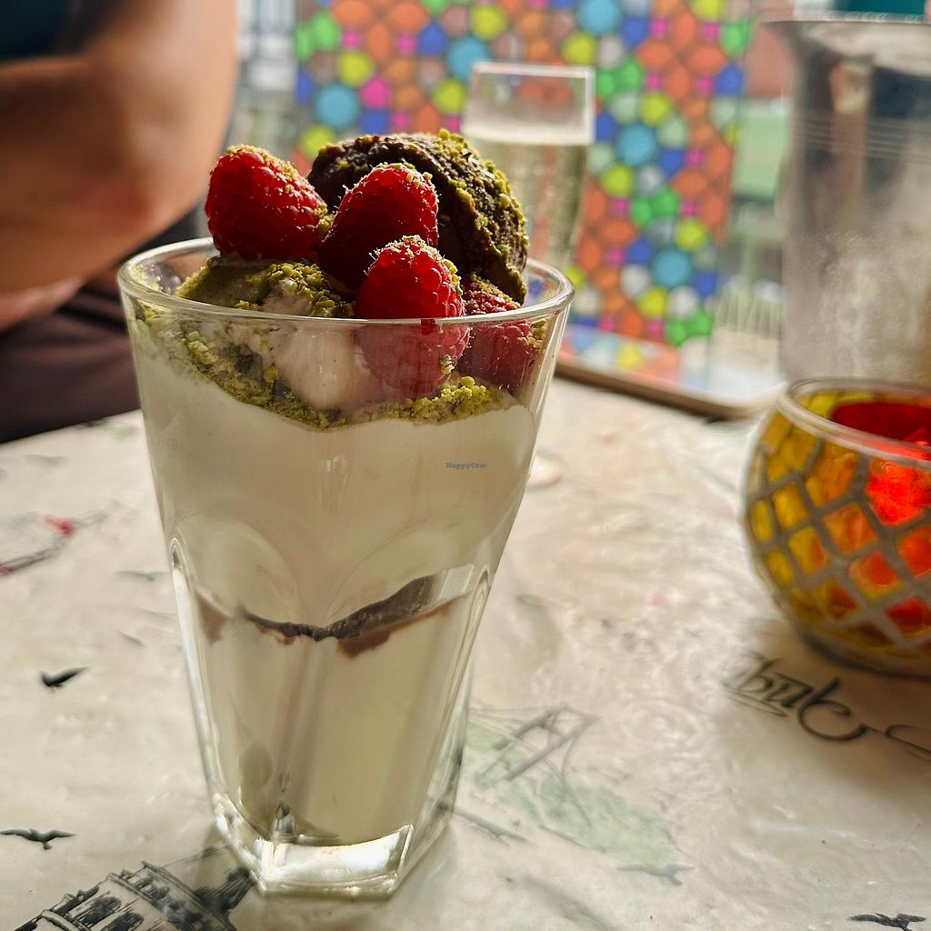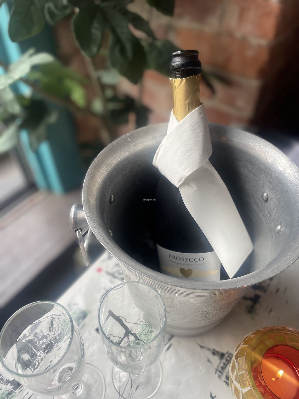 First visit here for mine and my partners anniversary meal. Very impressed with the rainbow staircase up to the restaurant. Also loved the decor, photos on the wall and the toilets were beautiful and very clean. We had the mezze board to start which was the highlight, delicious sauces and pitta. Waiter asked if we wanted more pitta and gave us more for free. The waiter also gave us the recipe for our favourite sauce. We both had the roast for our main. Gravy was delicious, broccoli was amazing and nut roast was so tasty. Didn’t eat the Yorkshire pudding because it knocked me a bit sick because it reminded me of an egg custard (the consistency) but I’ve also never had a vegan Yorkshire pudding before so maybe that’s why. Glad I saved it til last otherwise it would have put me off the meal. Roast potatoes were delicious, soft and fluffy in middle but could have been crispier on the outside. Also no stuffing which would have made it so much better. Finally there were no traditional roast dinner sauces like mint and cranberry which was a disappointment. The only other sauces were on the menu and weren’t really roast dinner appropriate and cost £1.50 each. We shared the knickerbocker glory desert but asked for it with no Vimto jelly. This cost us £10 and was extremely disappointing. The menu said it was served with chocolate and cherry icecream, there was no cherry in that icecream. It also stated a variety of fruit but it came with 4 raspberries on top, no other fruit inside. It was mostly cream. We didn’t finish it despite never wanting to leave food. Finally, I ordered the first bottle of Prosecco listed on the menu because I felt it was a bargain for £10.50. Yes it was my own mistake, because when the final bill came the Prosecco was actually £32.95 (the second one down). When I queried it the waiter said the first bottle is just a bottle for one. I felt the menu was a bit misleading. Yes it did say in the description of the Prosecco that it was a 20cl bottle but I do think the menu could have been clearer and either not listed it as a bottle or put in brackets after the price that it was a 20cl bottle. Waiter was friendly enough, was grateful that she gave us the recipe for the sauce we liked for our starter. But she never asked us how our meal was, neither of the courses. So I didn’t get the opportunity to tell her about the desert. I was also quietly fuming that I’d just spent £32.95 on Prosecco (p.s. I’m not a Karen I’m usually very easily pleased!)