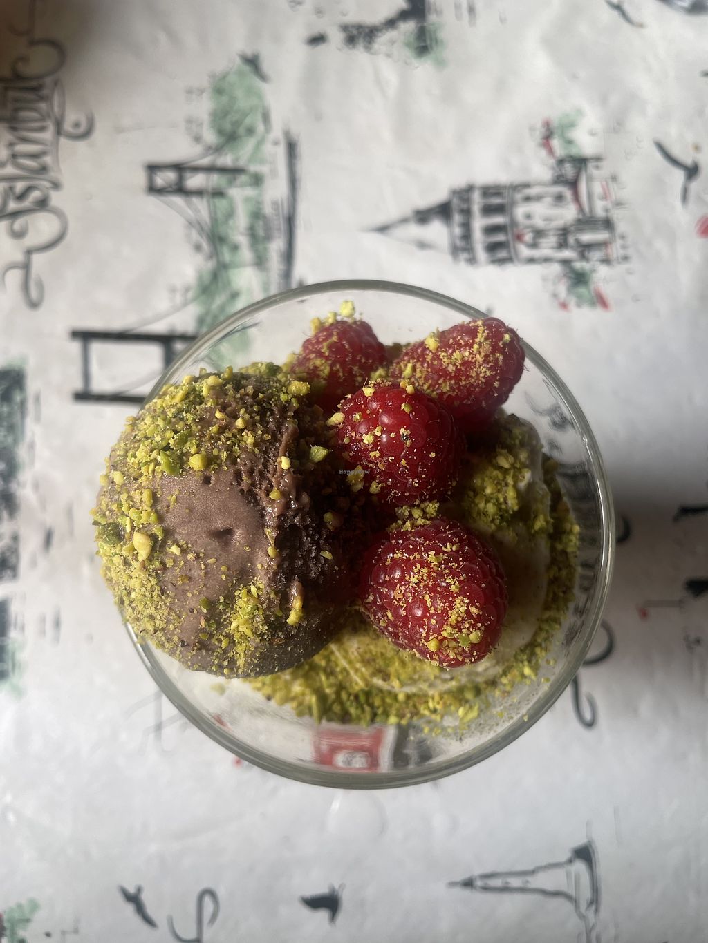 For dessert, we ordered the vegan knickerbocker glory without jelly, expecting a generous fruit selection as stated in the menu. At £10, we were disappointed to get a soda glass with a scoop of chocolate ice cream, lots of cream, and just four raspberries.