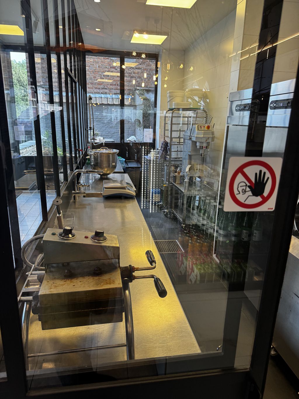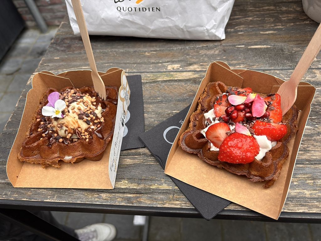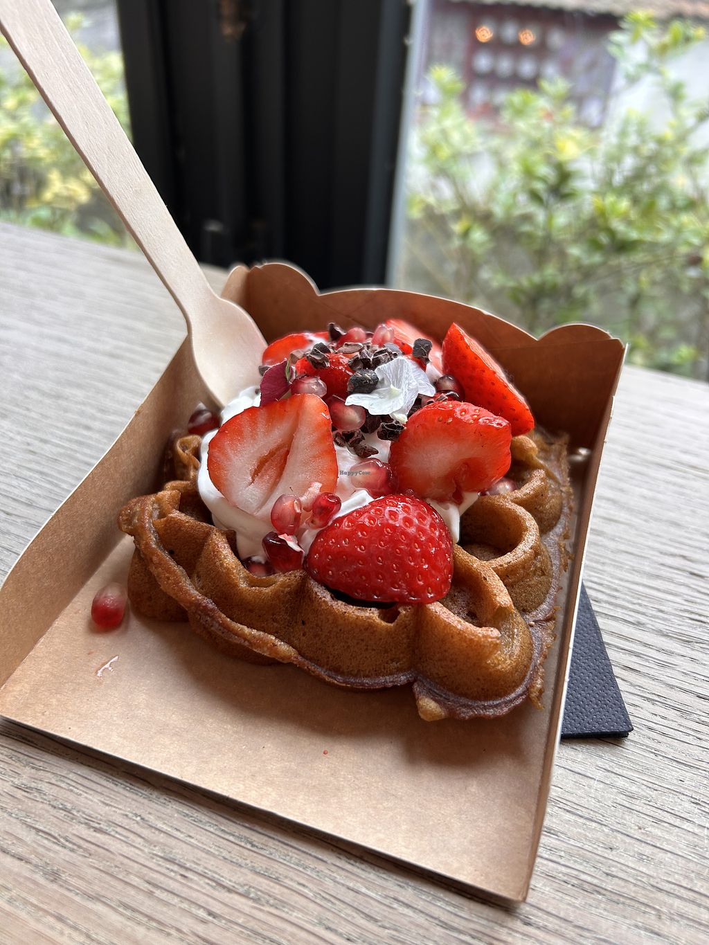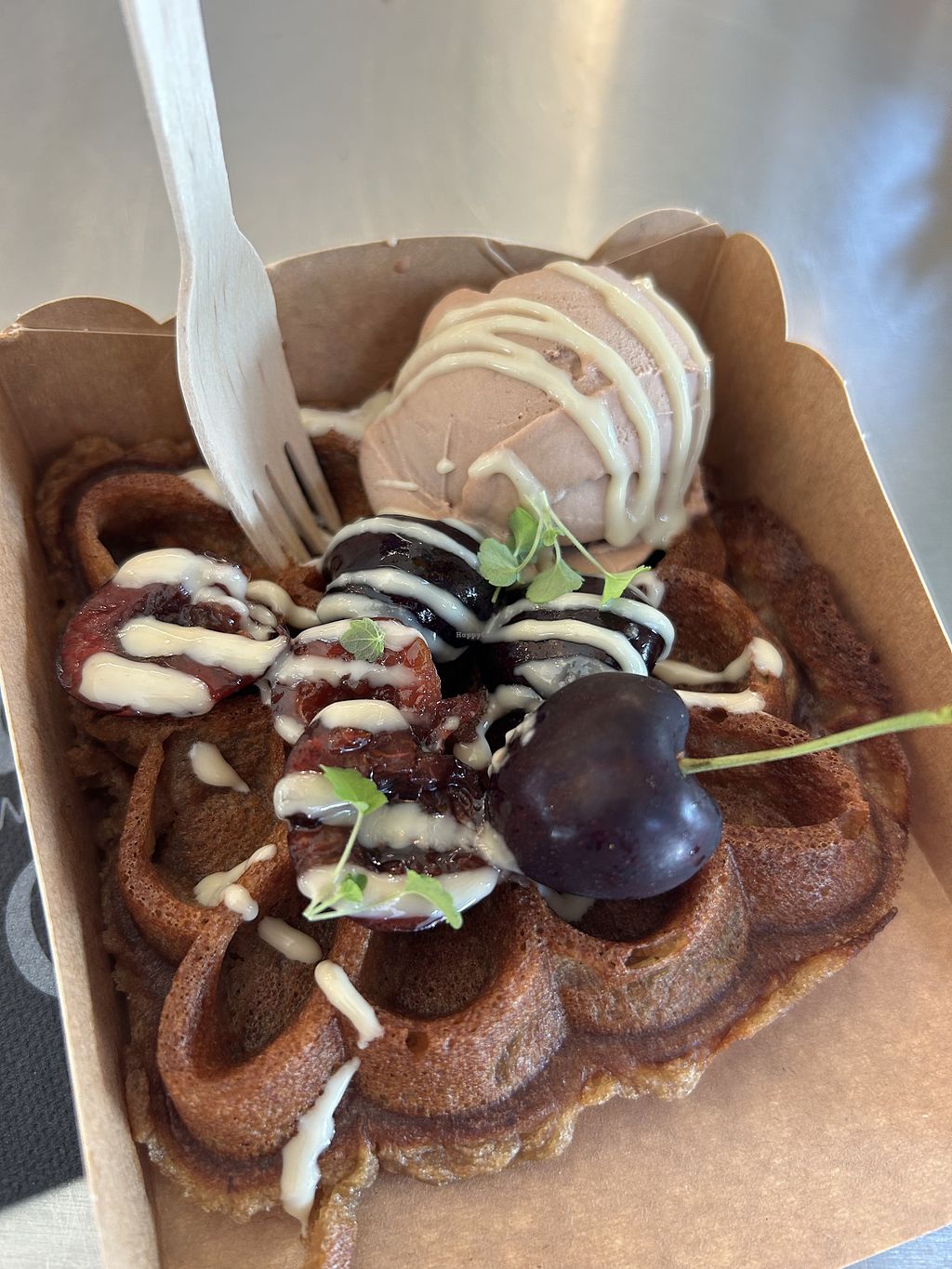 Vanilla ice cream, chokolate mouse, sirup and strawberries on a waffle…