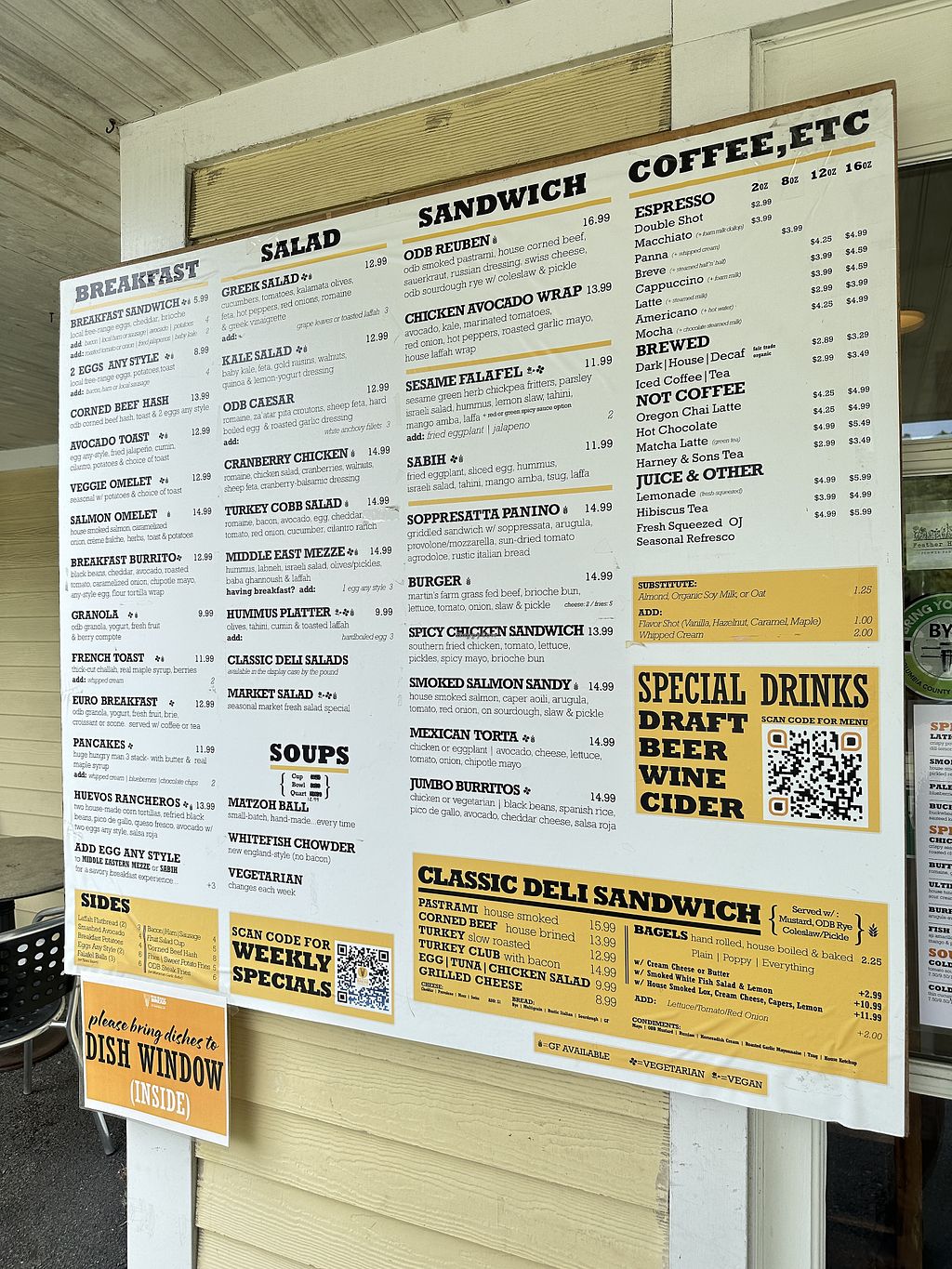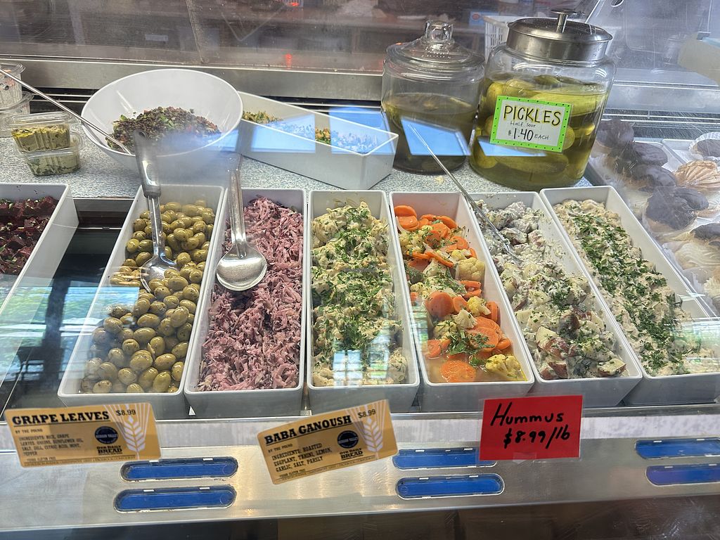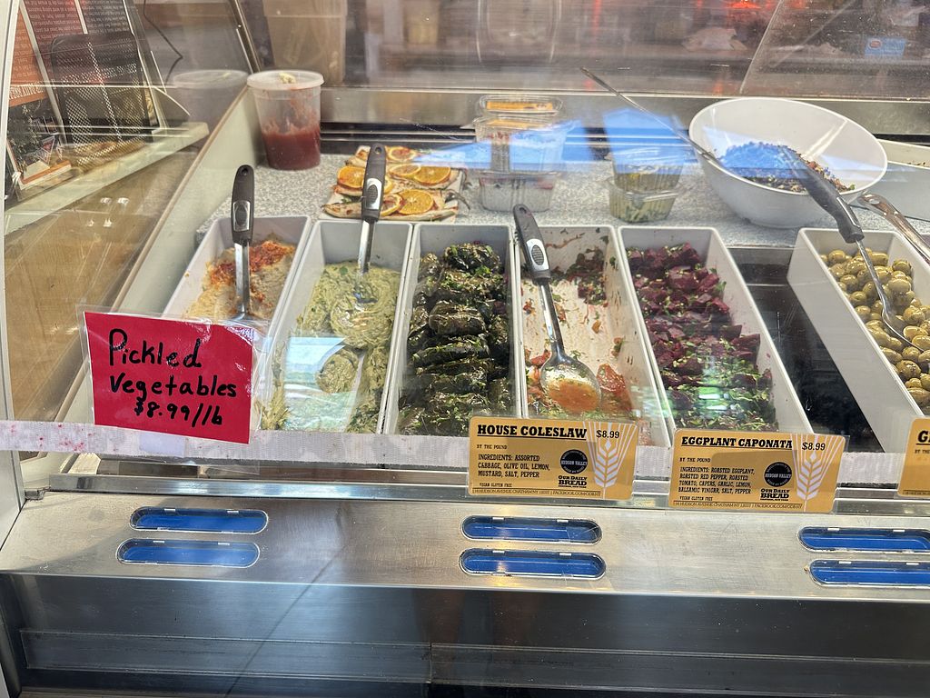 Bakery and deli offering vegan options, including clearly marked items like falafel and hummus platter. Some menu items can be made vegan. Features homemade cold prepared foods, bread, savory baked goods, and pastries. Seating is mostly outdoors. Open Mon 9:00am-3:00pm, Tue 9:00am-2:30am, Wed 9:00am-2:30pm, Thu-Fri 9:00am-3:00pm, Sat-Sun 9:00am-3:30pm. Closed Mon.