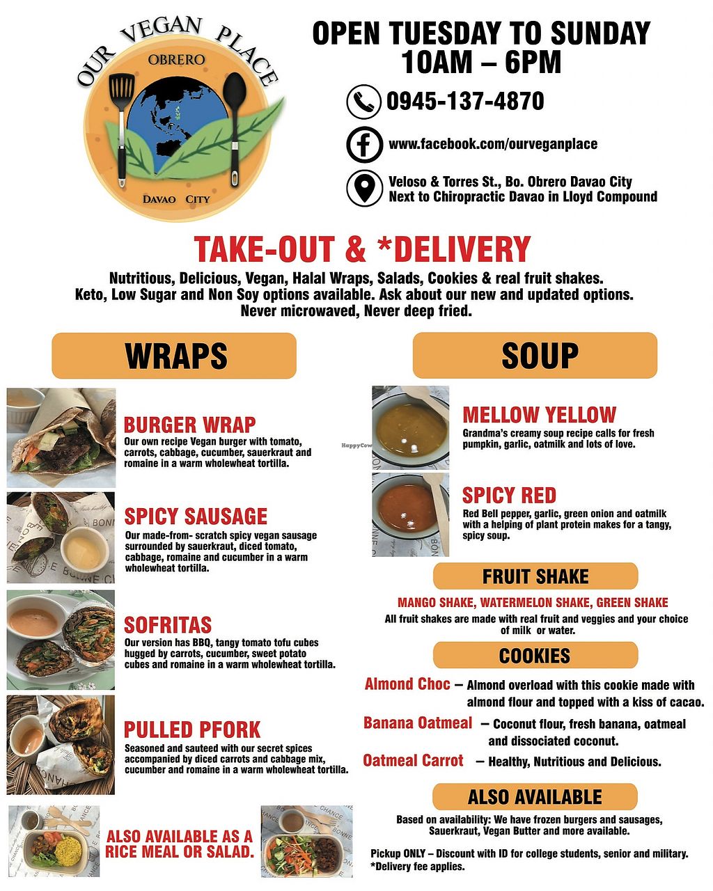 Vegan take out and delivery only. Offers wraps, rice dishes, salads, soup, fruit shakes and cookies. Does not microwave or deep fry food. Located inside Coffee at Yellow House. Previously named Our Vegan Place. Please update hours if known.