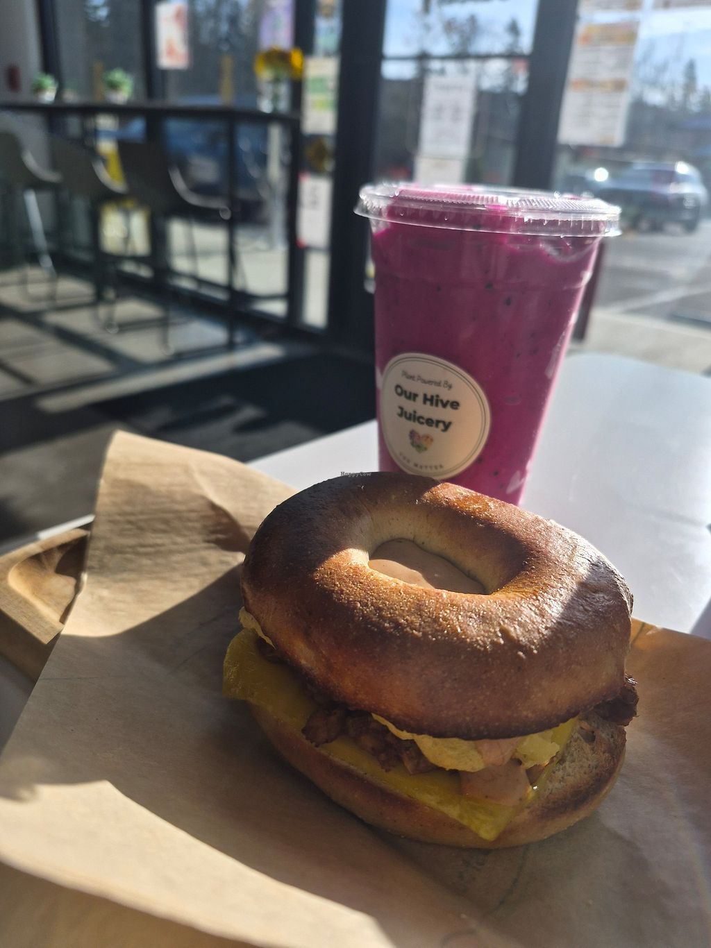 I ordered the vegan chicken bourbon bagel and the paradise smoothie, they were both really delicious. The smoothie was so fresh. I really liked the bourbon flavoring on the sauce.